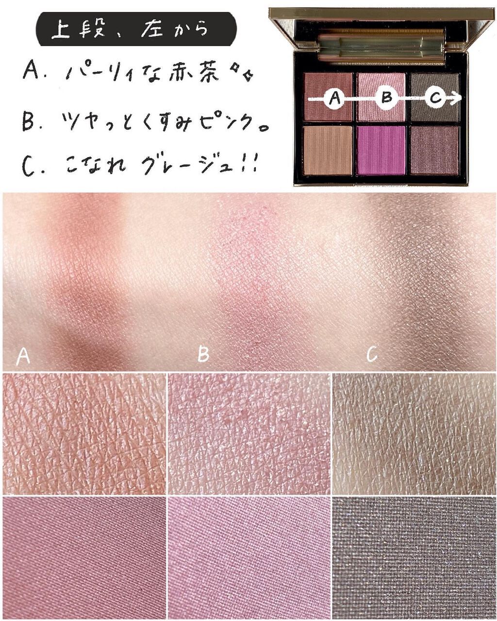アンプリのベーシック系のカラーの中でもひときわニュートラルな、色味を削いだようなベージュブラウン。 こちらも少し前(7/30)にレビューしているのでそちらもご参考いただけたら🙇♀️ このパレットはベーシックでありながらトレンド感もあるところがお気に入りポイントでして、ちょっとセピアを帯びたようなくすみ感がなんとも言えずお洒落な雰囲気を醸し出してくれます。 というのは全体的に肌に馴染むようなヌーディカラーで構成されたすごくナチュラルなシェードなんだけど、シルバー系のパールが潜んでいたり、少しくすみ感があったりと、甘さを取り除いてクールな仕上がりになるところがめちゃくちゃかっこいいのよ。 ダイヤモンドを彷彿とさせるような大粒のラメの煌めきがたまらなく美しいアイカラーです。 このパレットの好きなところは、マットが主役なところ。絶妙にニュアンスの異なる3色のマットでグラデーションしやすいのがミソです。 パールカラーの入れ方次第で表情が変わるパレットだと思う。