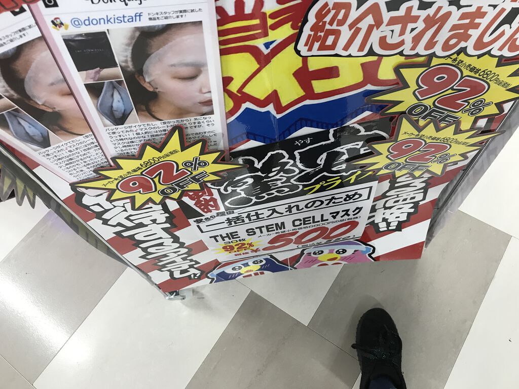 こんばんは〜 沖縄出身、くまです🐻‍❄️🐻‍❄️ 今日は、ドンキに買い物行きました! そしたら、シートマスクが500円⁉️ しかも、メーカーによると6500円⁉️ だそうです それが、500円で買えるなんてすごい‼️ 早速、使ってみたよ〜🌟 なんか、保湿されてる‼️(当たり前か笑笑) いつもの化粧水と違くて 細かく、保湿されてる感じがして、いい🙆‍♀️ でも、つけたとき 目のところが、結構ギリギリだったから 目にシートマスクの汁?😅が 垂れてこないか心配だったけど垂れてはこなかった。 だからもうすこし、目のところは 余裕がほしいかな〜って思った‼️ それ以外は、よかったね。 後は、シートマスク チャック式なので、乾燥が心配です😭 なので明日、 3枚目の写真のような商品買ってきます‼️ 買った場所はとみしろのドンキでーす😁 入り口入って、サービスカウンターの すぐ左に置いてました😁