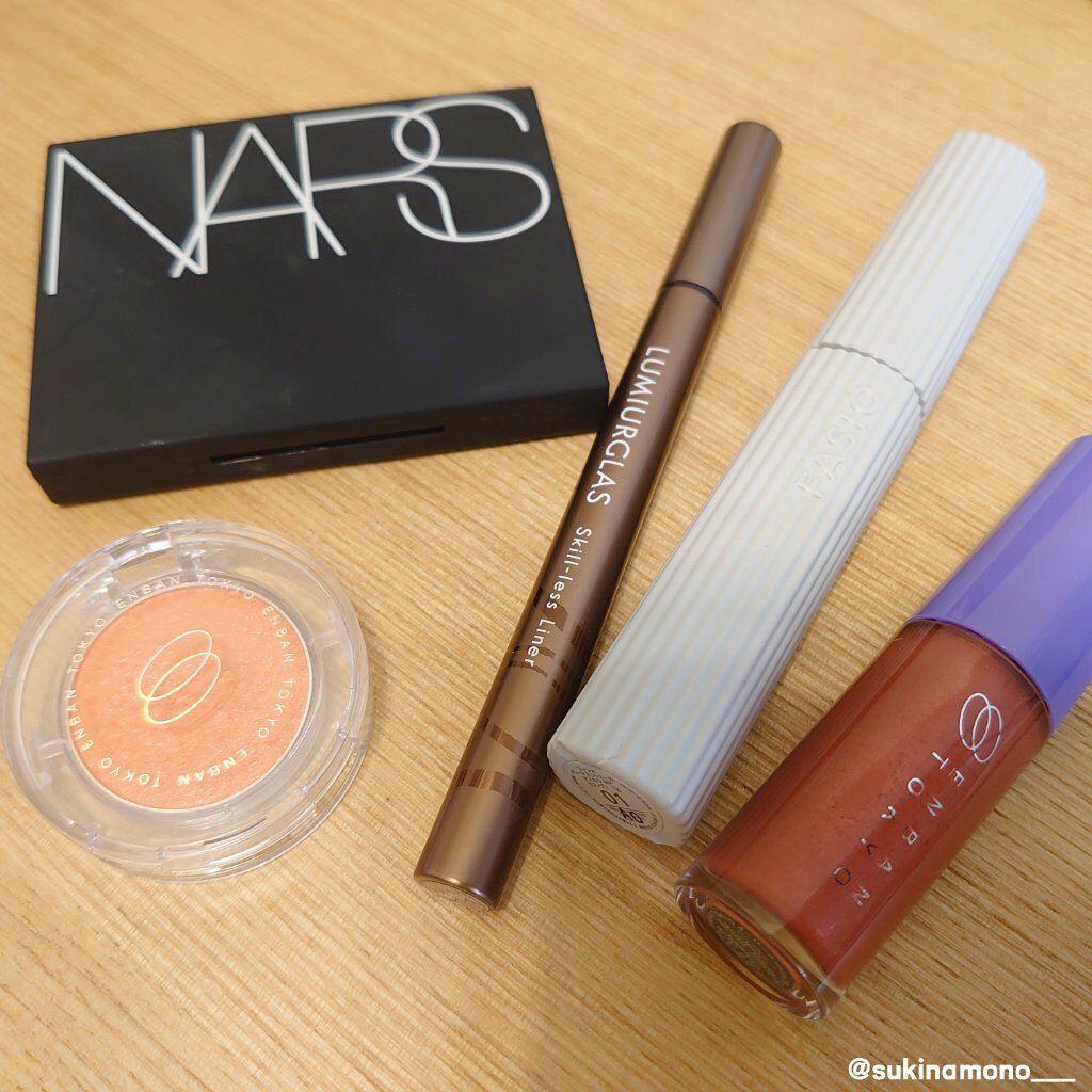 ハロウィンにも使える?オレンジまみれなメイク🍊 アイライナーも高発色なオレンジライナーを使ってとことんオレンジ! マスカラはブラック、チークはブラウン系のオレンジチークにして全体のバランスをとっています👀❤️ このアイライナーをパープルにしてもハロウィンぽいかも🎃💜