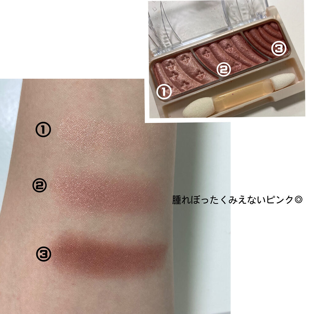 - 3色で簡単に明るく大きな目元に。 しっとり感触のアイシャドウ。 くすみを飛ばす明るさベース、ひとえ・奥二重の方でも幅広く塗れる肌なじみの良い中間色、 濃密高発色の締め色が目の輪郭を強調し大きな目元に。 微細パール配合でくすみを飛ばし、明るい目元へ。