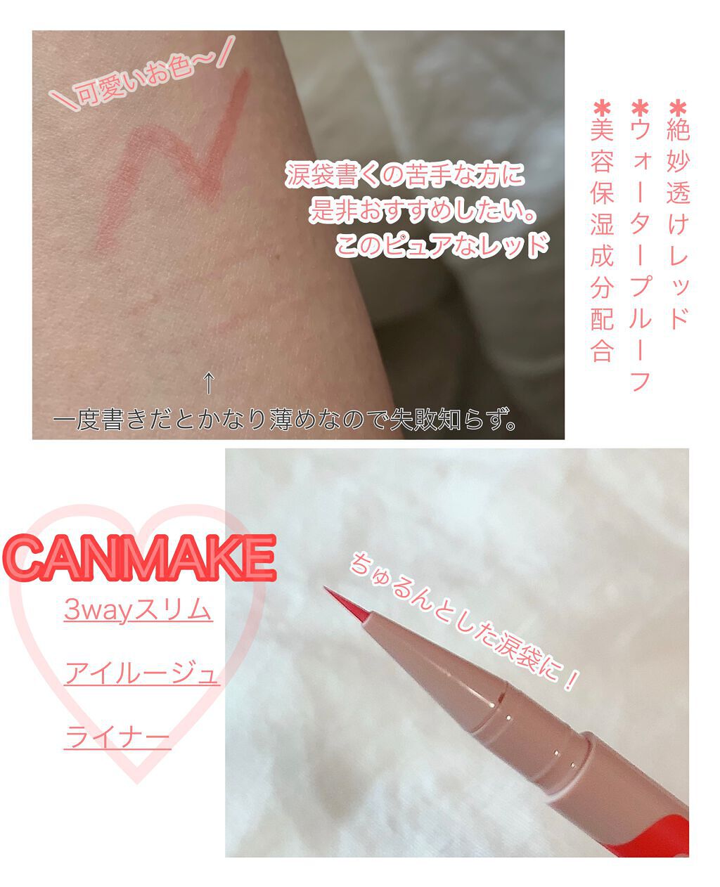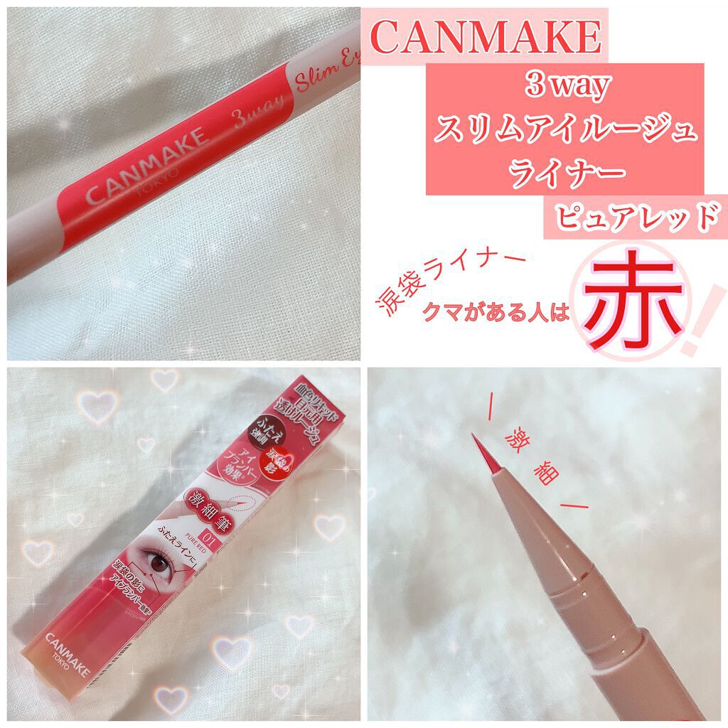 ⚫️キャンメイク3wayスリムアイルージュライナー01ピュアレッド少しでもメイクで中顔面短縮したい😭!という事で、主に下瞼のキワに使用してます。透け感があって、良い意味で薄付き💞薄付きだから多少ミスった!って時も目立ちにくいし、重ね塗りしても...
