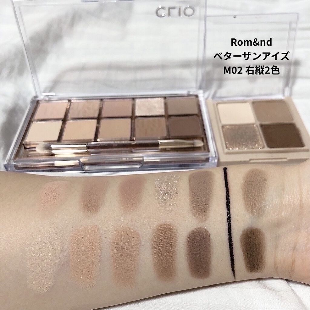 ミュートカラー9色+ホワイトグリッター1色の合計10色。 どれをとっても使いやすい。 マット9色+グリッター1色構成。 マットはサラサラ高発色、グリッターはロムアンドのグリッターよりしっとりしていてこちらも高発色です。 発色が良いが故に、アイブロウにもチークにも使えてしまうということ。 かなり中間色ばかりのパレットですので、しっかりとメリハリをつけることで雰囲気のあるメイクに仕上がるかと思います。