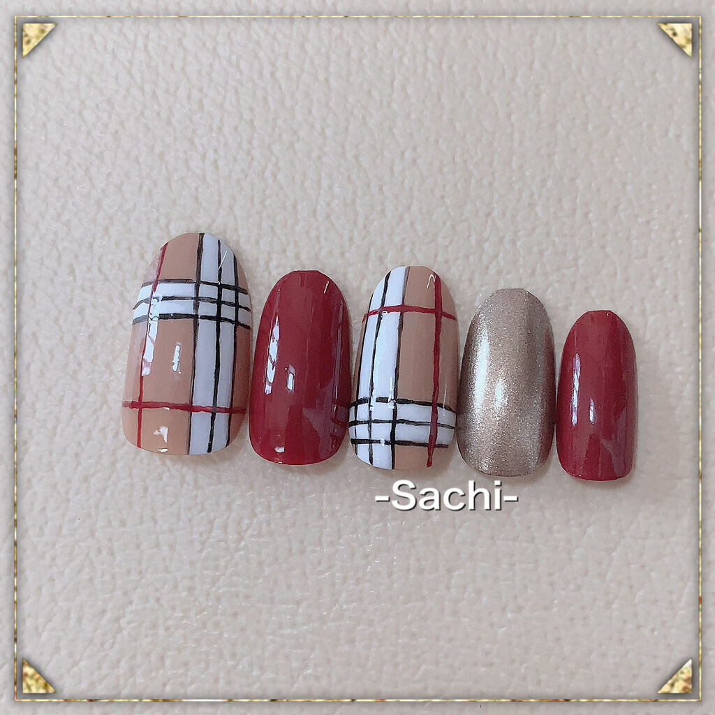 ストロングガードを1度塗り。親指、薬指は天狗。人差し指、小指は九尾の狐。+少量ホワイトをそれぞれ2点ずつ置き、ミルクシロップでマーブルに。 中指は九尾の狐を2度塗り。WT080で縦横ラインを描いて、交差するところにリボンシールを。