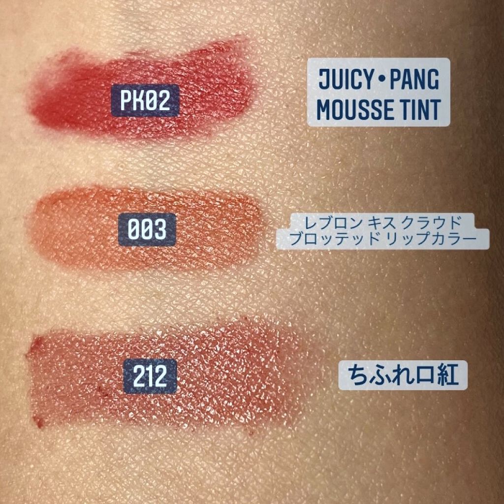 ティントは、やはり落ちにくくて長時間カラーを保ってくれる優れものです! ちふれの口紅は、お手頃価格で試しやすい✨さらにたくさんの色を展開しているので自分に合った色を見つけることが出来るはずです! 📍オピュ JUICY・PANG MOUSSE TINT【PK 02】 ¥1087 雑貨屋さんで購入しました☺︎ 📍レブロン キス クラウド ブロッテッド リップカラー【003 ROSY COTTON CANDY】 ¥1300+税 PLAZAで購入しました☺︎ 📍ちふれ口紅 【212】 ¥385(税込) イオンモールで購入しました☺︎