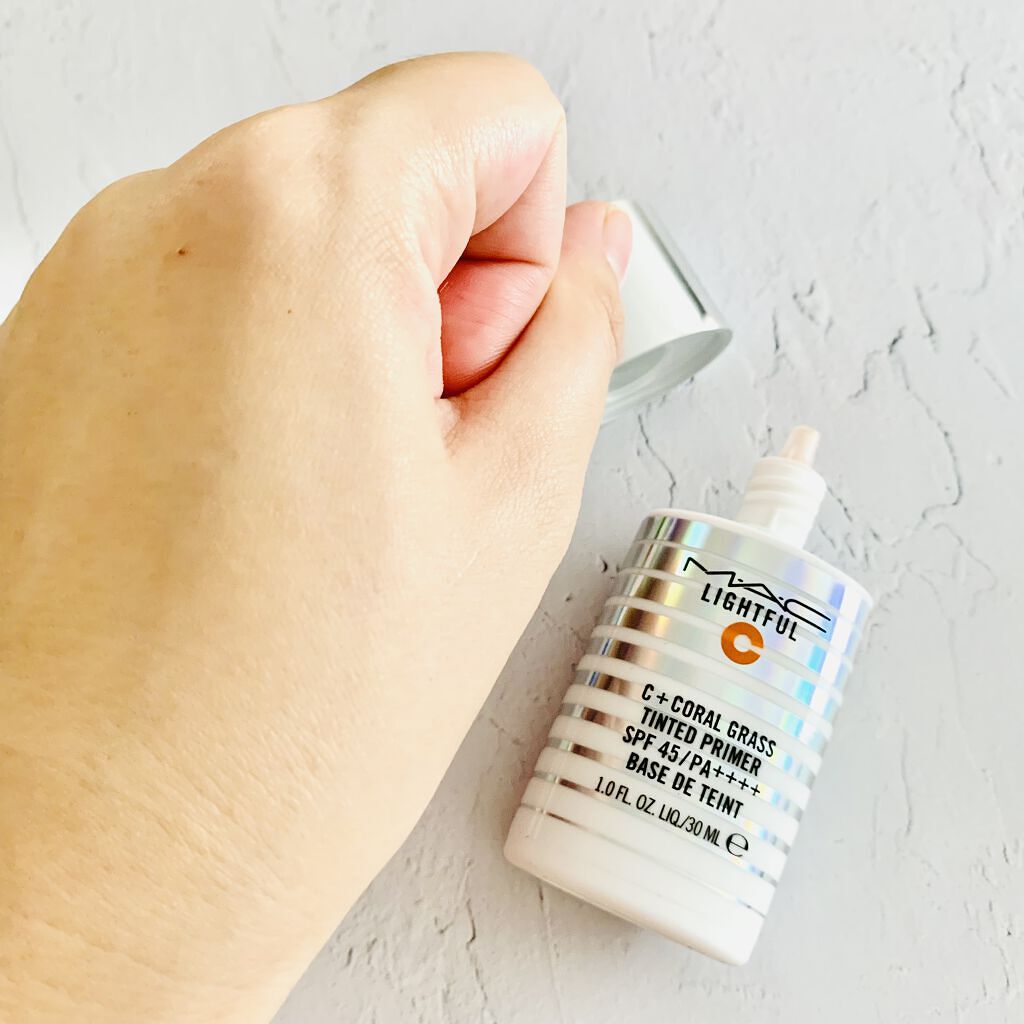 保湿感・ツヤ感・密着感◎ 【M・A・C/ライトフル C+ティンティッド プライマーSPF45】 緩めのテクスチャーで伸びが良いです◎ SPF45/PA+++++で紫外線対策もできてオススメ👾 保湿感があり、乾燥を感じにくくてお気に入り🫶🏻 ツヤ感が出て綺麗な仕上がりイメージ