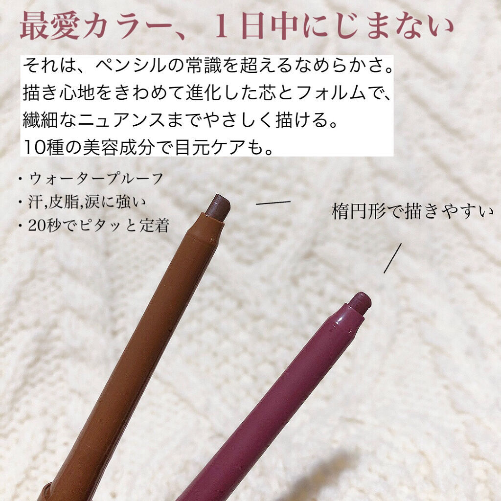 - 肌あたりがまるでクリーム。するする描けて一日中崩れない。※1 ■長さと重さを付けた新形状の繰り戻し可能容器で、手ブレしにくく描きやすさアップ。 ■ドロースムース設計で密着成分と揮発成分が顔料を包み、なめらかな描き心地を実現。 ■汗・皮脂・涙・こすれに強いWプルーフ設計。 ■美容成分※2 を5種類から10種類にアップ。 ※1 社内試験済。効果には個人差があります。 ※2 保湿成分のこと <カラー展開> ■ミディアムブラウン 陰影のある目元を作る黄み寄りのビターなブラウン。洗練された大人の存在感を。 ■アッシュブラウン ほんのり赤み系ブラウンでふわっと自然な抜け感。ほの甘く、柔らかな表情に。 ■ロージィブラウン 華やかで印象的なくすみピンクブラウンで血色感のある目元に。 ■メープルブラウン オレンジ系ブラウンの透け感ラインで、目元にピュアな明るさを。 \2023.9 new/ ■ブラック 目元をくっきり強調する洗練カラー。