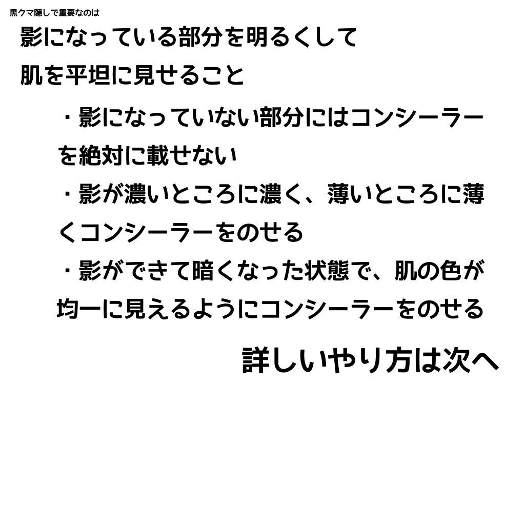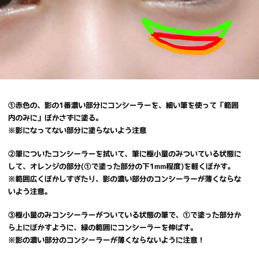 黒クマは、他のクマとは違い、肌に色がついているわけではありません。 黒クマを隠すためには、《影がない》と錯覚させればいいのです! 影のある部分に明るい色をのせて、肌の色を均一に見せることで、凹凸なく、クマのない肌に見せることができます。 黒クマは「上をむくことで影が消える」ので…。 少し不自然ですけど、黒クマがあるのに比べたら100倍マシだし気にならないと思うのでオススメします!