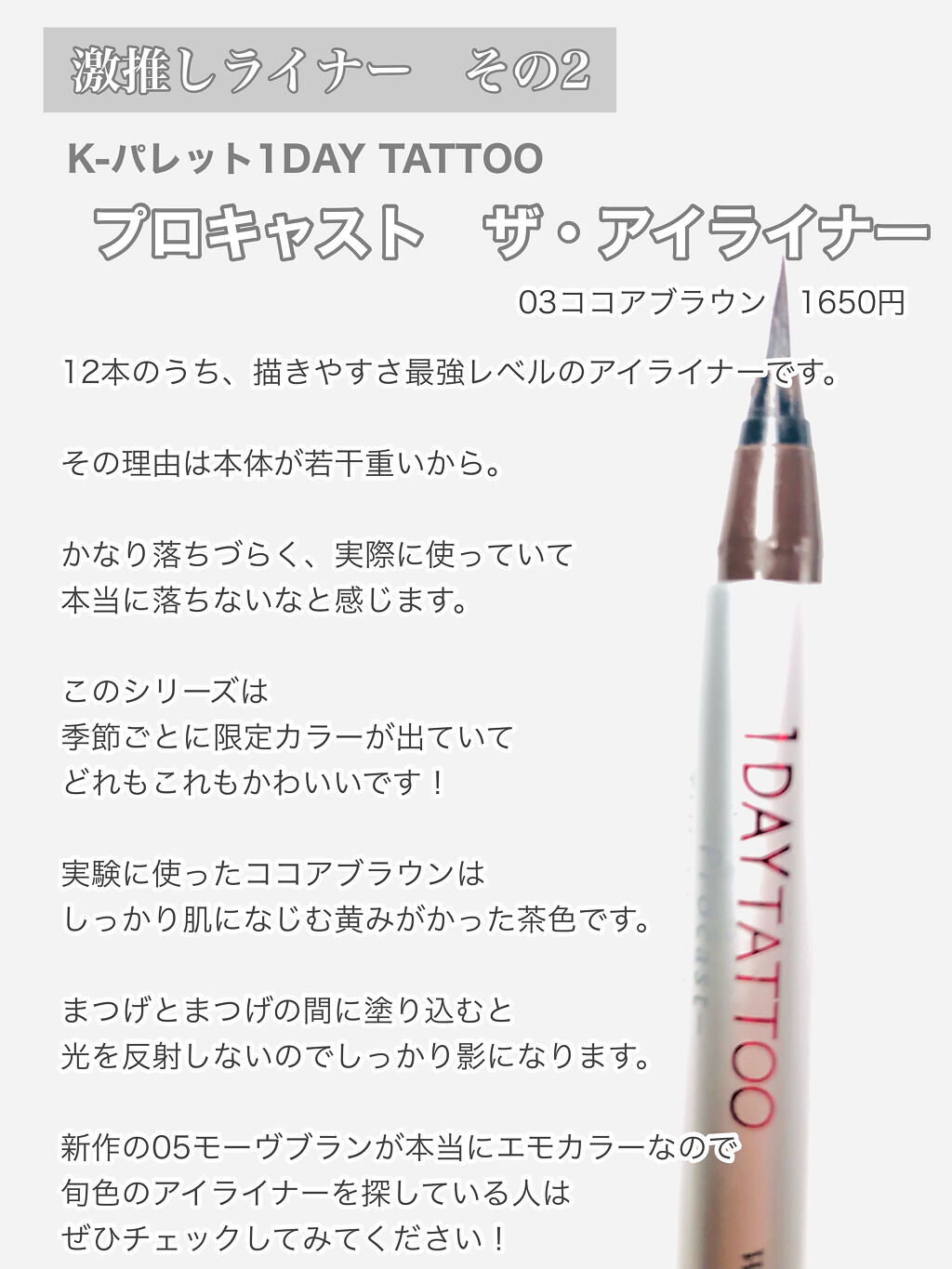 K-パレット1DAY TATOO リキッドアイライナー ほの甘ブラウン私的リピなし商品です💦こちらドラッグストアでワンデイタトゥーというフレーズが気になって初購入しました。使ってみると、なかなかはっきりと色が付かない…?線が引きにくい…。でも...