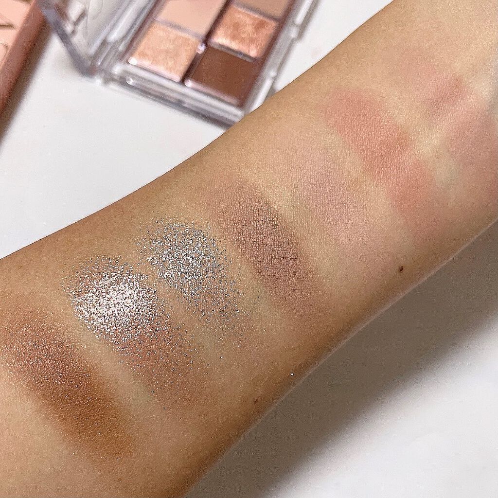- 同系色陰影カラーと上品でクリアなグリッターの組み合わせの必要なカラーだけ詰め込んだミニアイパレット!