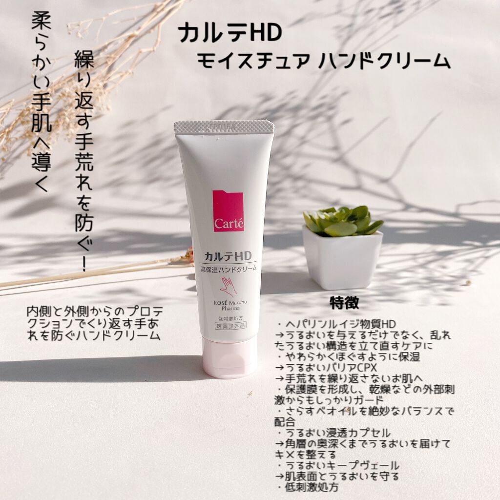 - 【高保湿ハンドクリーム】 硬くあれがちな肌もふっくらうるおいに満ちた美しい手肌へ。信頼の保水有効成分「ヘパリン類似物質HD※」をコーセーグループにおいて初めて配合した低刺激処方の高機能ハンドクリームです。ヘパリン類似物質HDが、過酷な環境にさらされ続けることで壊れやすい手肌のうるおい構造を立て直し、内側からのプロテクト機能をパワフルに強化。うるおいキープヴェールが、肌の表面をしなやかな保護膜でおおって、外側からもしっかりガード。手肌表面を守るだけでなく、外部刺激に負けにくくします。なめらかなクリームは、硬くごわついた手肌をほぐすようになじんで、ベタつかずしっとりやわらかなあと肌に。手あれスパイラルを断ち切り、ふっくら手肌を叶えます。 ※ヘパリン類似物質のこと <販売名:HDハンドクリーム>