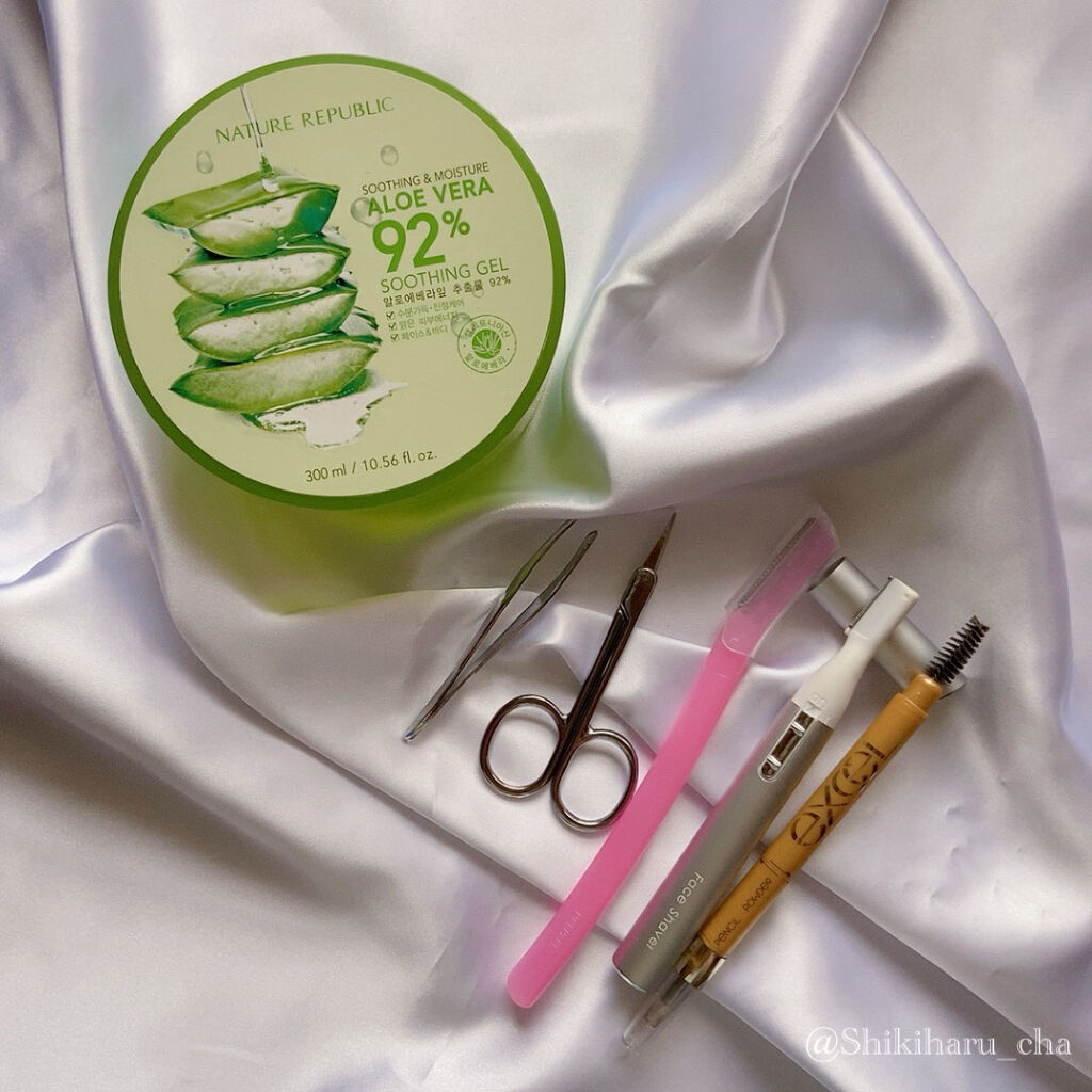 眉毛を整えはじめて3~4年、やってて良かったなと思うのはメンテナンスする瞬間 定期的にメンテナンスしていると毎回 眉毛の形に悩まないでいいのがメリット◎ 抜く毛があるので、負担を減らすためにもメンテナンスを始める前にあっためて毛穴をひらいてから始めます☝️ 剃毛をするので、乾燥を防ぐためにスージングアロエジェルを厚めに塗ります🌿 どんな形の眉毛を描くとしても絶対に必要の無い部分に生えている毛をピンセットで抜く 眉山は抜いてしまうと生えてこなくなる可能性&黒ずんだり青くなったりするので、できる限り抜かない🙅♀️ スクリューブラシ(持っていないので私はアイブロウペンシルの逆側で代用)で毛流れに沿って向きを整えます(毎日メイクの仕上がりに響くので大事です!) 最後は切った毛を落とすために顔を洗ってしっかりとスキンケアで保湿しましょう🌿 beforeとafterであまり差が無いように見えますが、個人的には要らない毛が無くなるだけでもスッキリして眉が描きやすくなりました◎ 定期的に続けていればお手入れが楽になりますよ😚