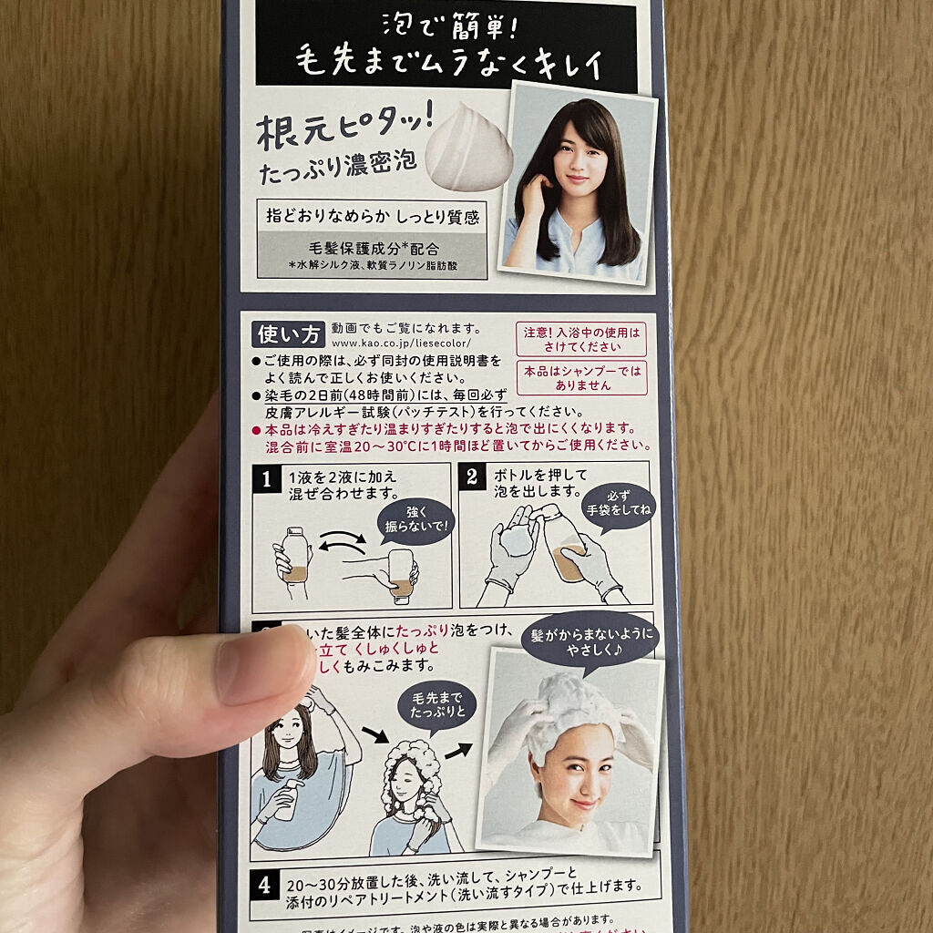 - 【医薬部外品】 【黒髪用ヘアカラー】 泡で簡単! 濃密泡が染まりにくい根元や見えない後ろにもしっかり密着して、ムラなく美しい仕上がりを実現。 透明感とやわらかさを表現するために、グレーやブルーの色味をブレンドした「サロン発想」の色設計。 毛髪保護成分*配合。指通りなめらか、しっとり質感の染め上がり。 *水解シルク液、軟質ラノリン脂肪酸 アフターカラー用リペアトリートメント(化粧品)つき。 ●セミロングヘア(肩から脇の下くらいの長さ)1回分 ●1回使いきりタイプ ●白髪用ではありません ※使用上の注意をよく読んで、正しくお使いください。 ※ヘアカラーでかゆみ、発疹、発赤がでたことのある方は、絶対に使用しないでください。