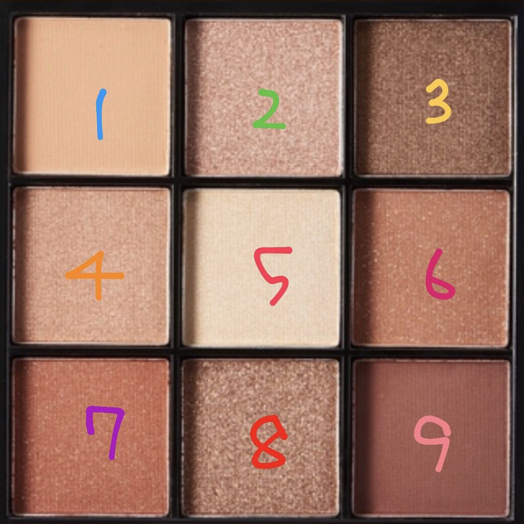 URGLAMの9色アイシャドウパレット01を塗る。(5、6枚目を見てね^^) sopoのカラーマスカラ03を眉毛とまつ毛に塗る。(ファミマに売ってます。) CEZANNEの極細 アイライナーRのブラウンでアイラインを引く。