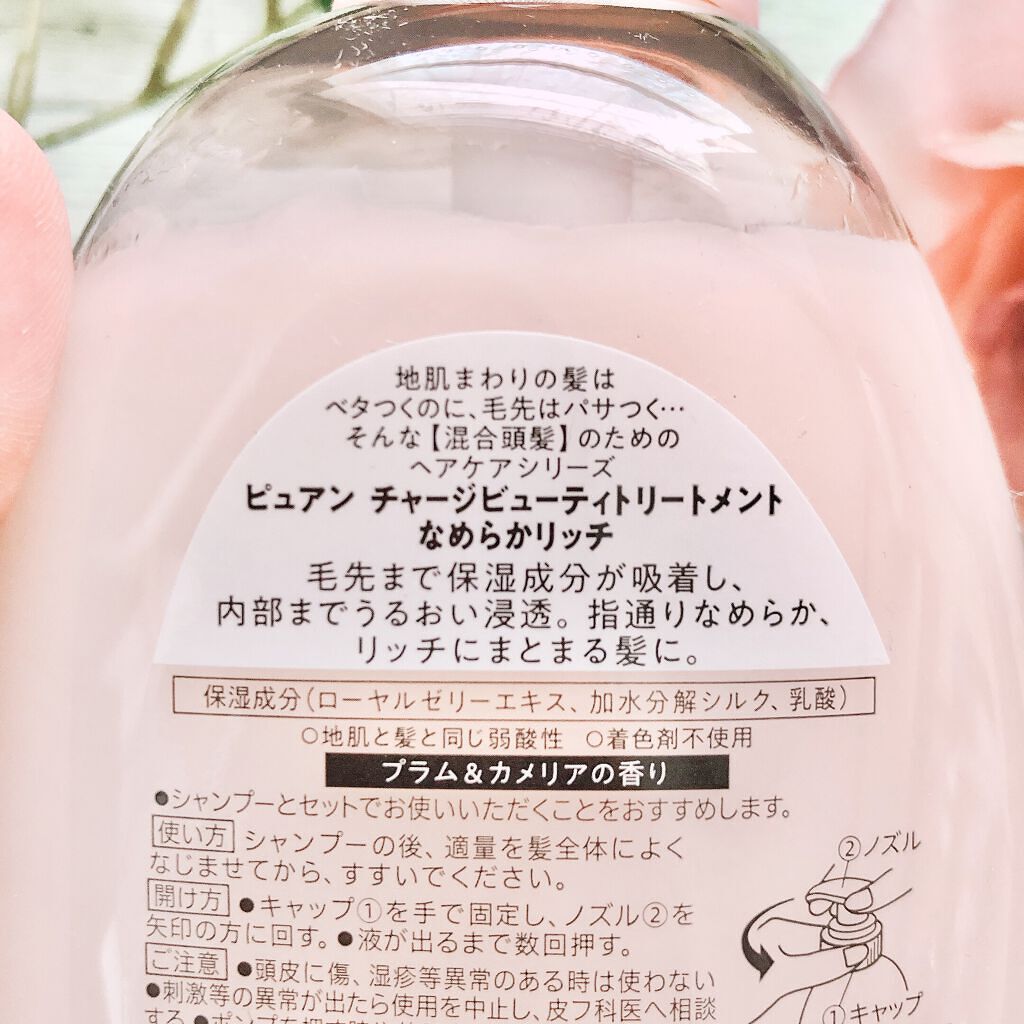 - 根元はベタつくのに毛先はパサつく“混合頭髪”のためのシャンプー&トリートメント。 「汚れを落とす」と「うるおいで満たす」という2つのアプローチで、根元は軽やか、毛先はうるおってまとまる髪に導きます。 <ピュアン デトクレンズ シャンプー> 一日の“蓄積汚れ※”をデトクレンズ シャンプーでしっかりオフ。 あとに使うトリートメントのなじみを良くします。 ●ノンシリコーン処方 ●地肌と髪と同じ弱酸性 ●着色剤不使用 ※ スタイリング剤や、ついつけすぎてしまったトリートメントやオイルと皮脂などが混合した汚れ <ピュアン チャージビューティ トリートメント> 毛先まで保湿成分が吸着し、内部までうるおい浸透。 指通りなめらか、まとまる髪に。 ●保湿成分(ローヤルゼリーエキス、加水分解シルク、乳酸) ●地肌と髪と同じ弱酸性 ●着色剤不使用 指通りなめらか リッチにまとまる髪に みずみずしく艶やかな プラム&カメリアの香り