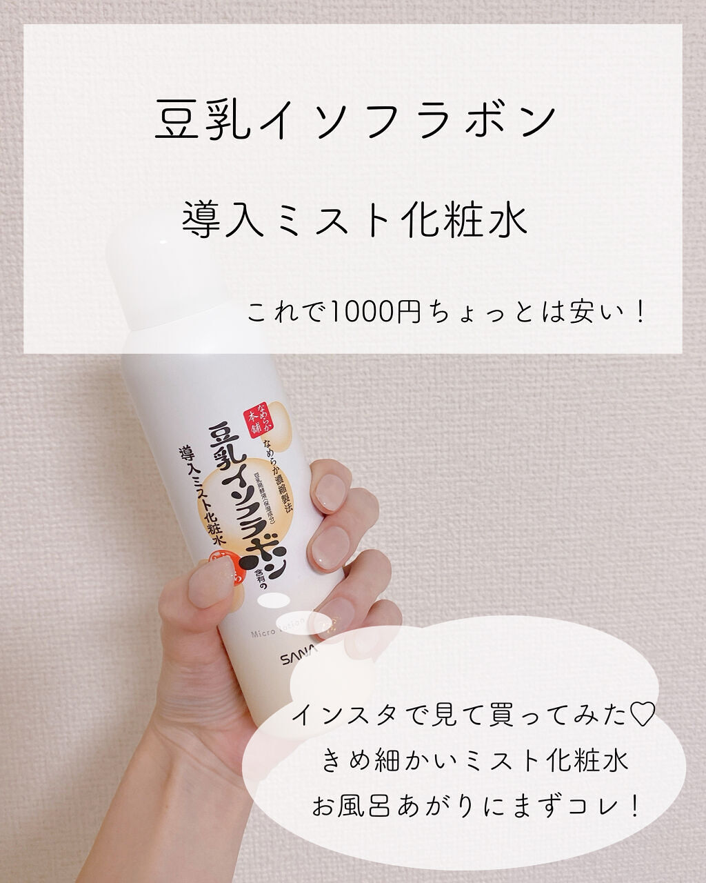 お風呂上がり3秒で保湿できるスプレー化粧水✨ 細かなミストが気持ちよく使えて、お風呂上がりすぐスキンケアできなくての突っ張り感も感じなくなるし、その後のスキンケアの導入化粧水にもなってくれる👏 毛穴より細かく、肌あたりの良いマイクロミストが角層まで浸透し、うるおいのあるお肌に導く😊 九州産大豆「ふくゆたか」から作られた高純度豆乳イソフラボンと豆乳発酵液、さらにヒト型セラミド配合🙌