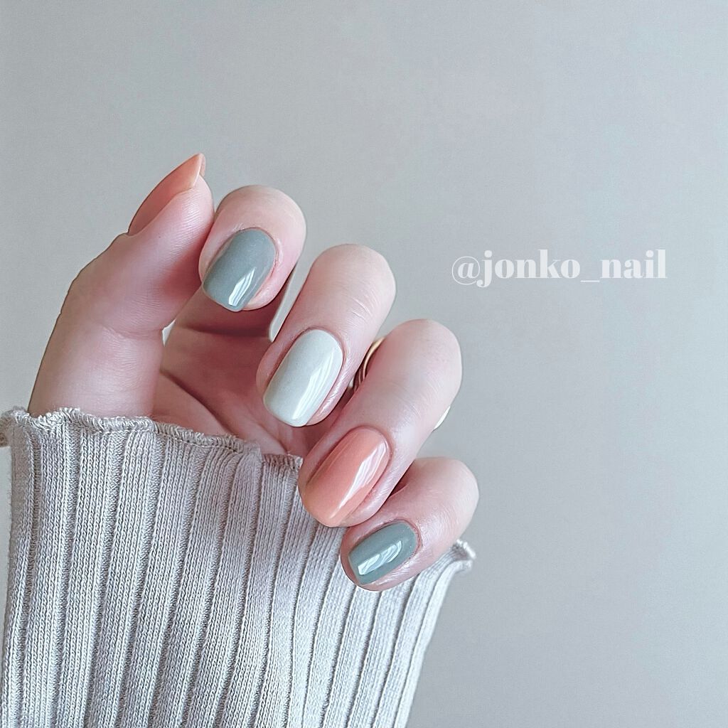 電車に乗っていたら向かいの可愛いお姉さんがこんな配色でネイルしてたんです☺️ それがどうにも可愛いくて…♡ 次のネイルは決まり!って思って スマホに「オレンジ、カーキ、アイボリー」ってメモしちゃいましたᝰ✍︎꙳⋆ こんな配色は自分では思いつかないなぁ🥺