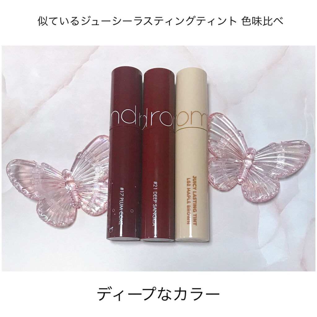 rom&ndのジューシーラスティングティントリメイク前バージョンです。#12CHERRYBOMB#17PLUMCOKE#21DEEPSANGRIAシロップを唇につけるような粘り感😂何回を分けて重ねていく方が綺麗に塗られますが、すごく時間かかり...