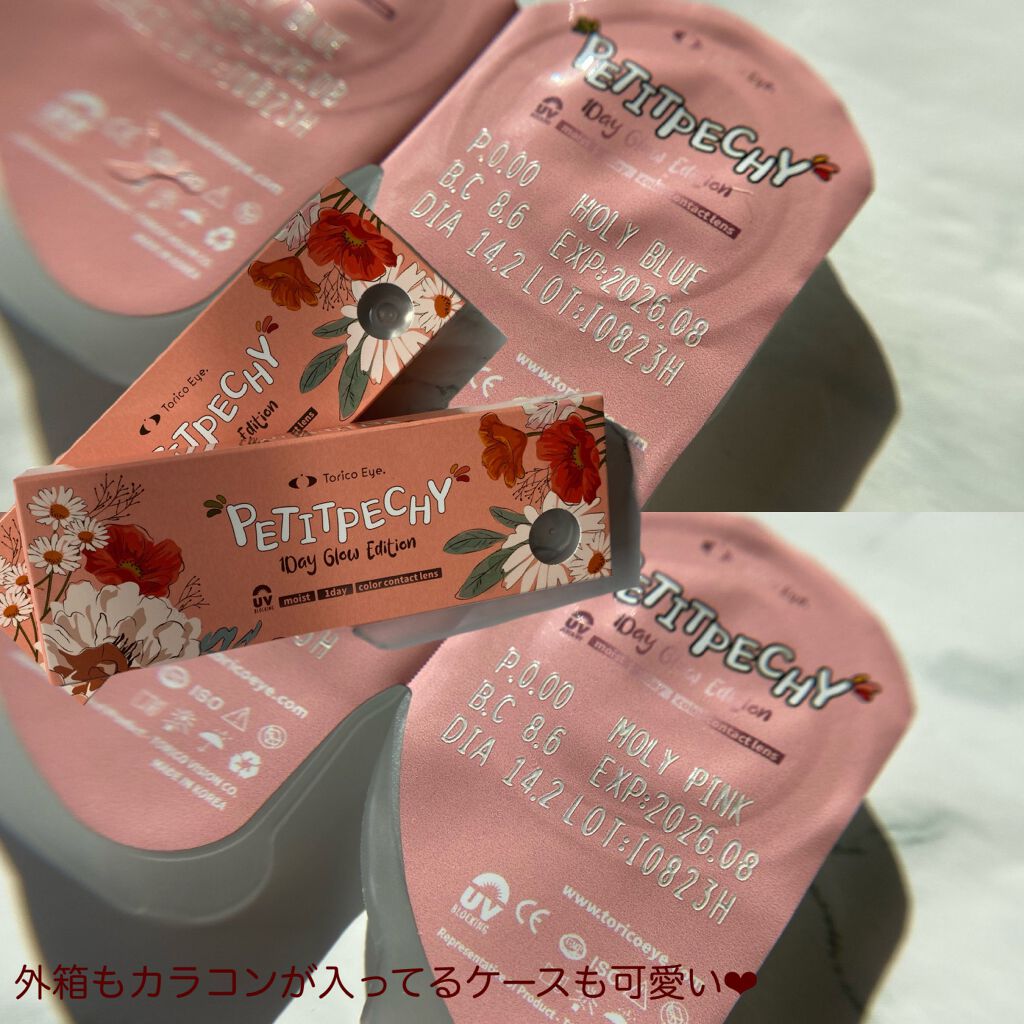 ToricoEye.PETITPECHY1DayGLOWEDITION含水率38.5%BC8.6mm着色直径12.7mmDIA14.2mm度なし/度ありツヤデザインのカラコン👀♡上側がHOLYBLUE(ホーリーブルー)下側はMOLYPINK(...