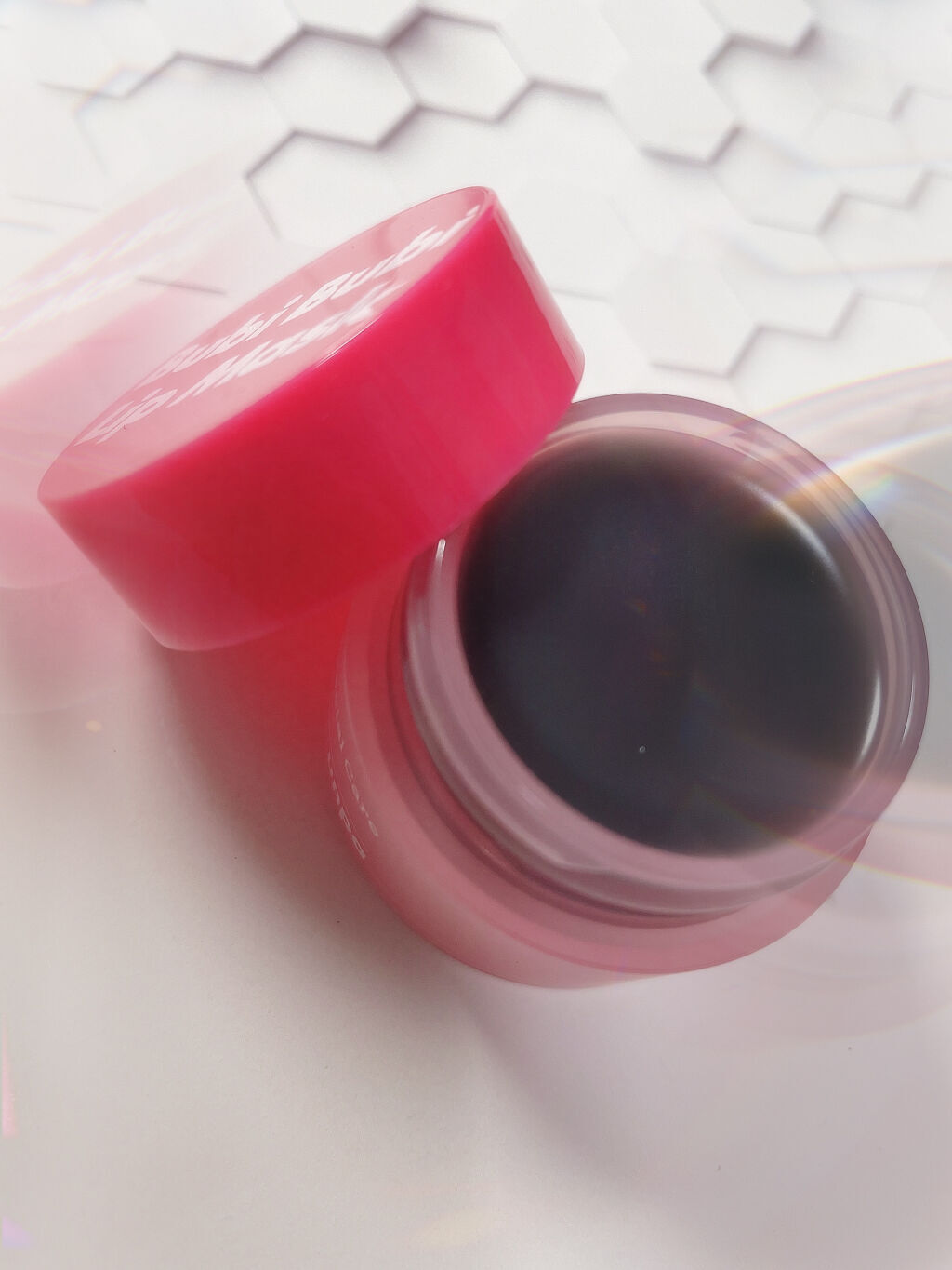ピンクの可愛い容器からは驚きの中身は黒! 唇につけると少しダークになります。似合わない色のリップに重ねても良さそうです🌷𓇢 保湿力は高めでベタつきは無いですが保湿されてる!っていう感じがあります。 独自成分のBlack Food Complex(コラーゲン誘導成分)を配合。優れた効果でシワを改善。
