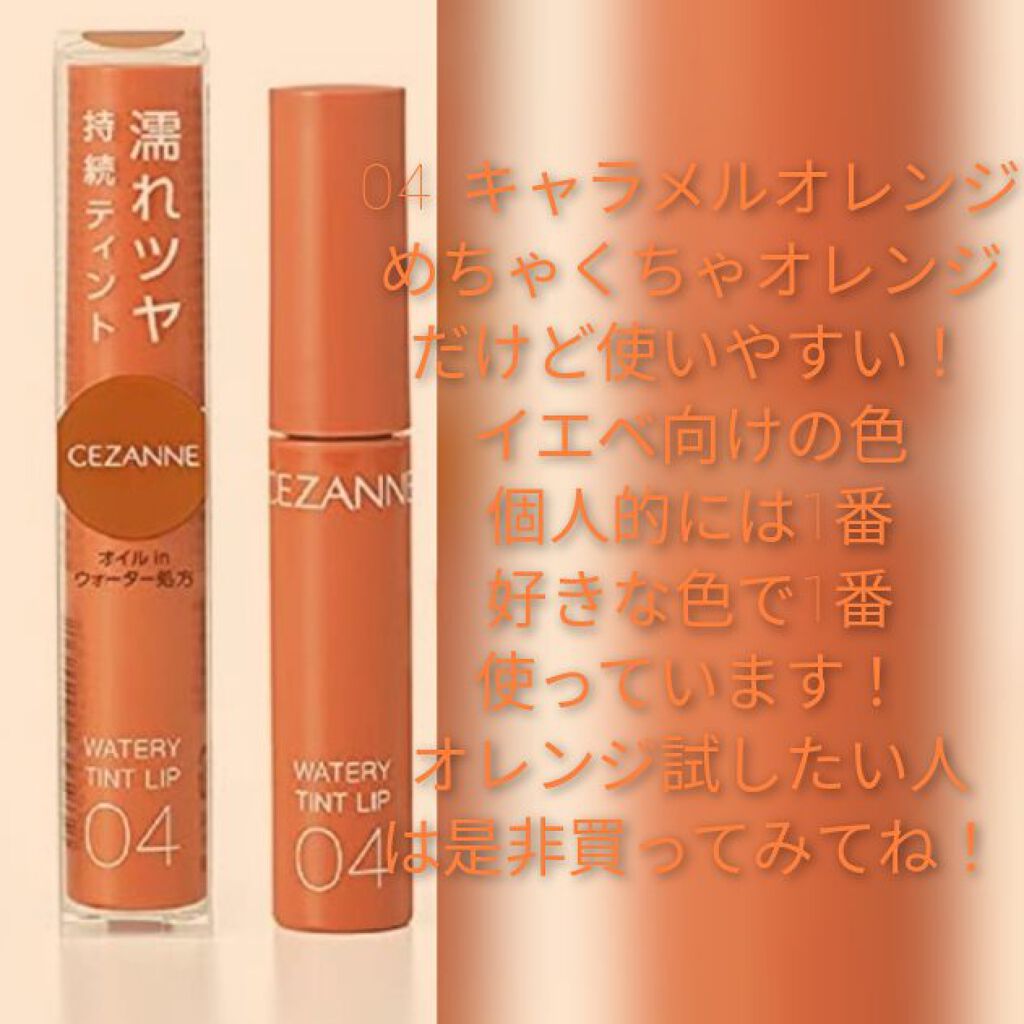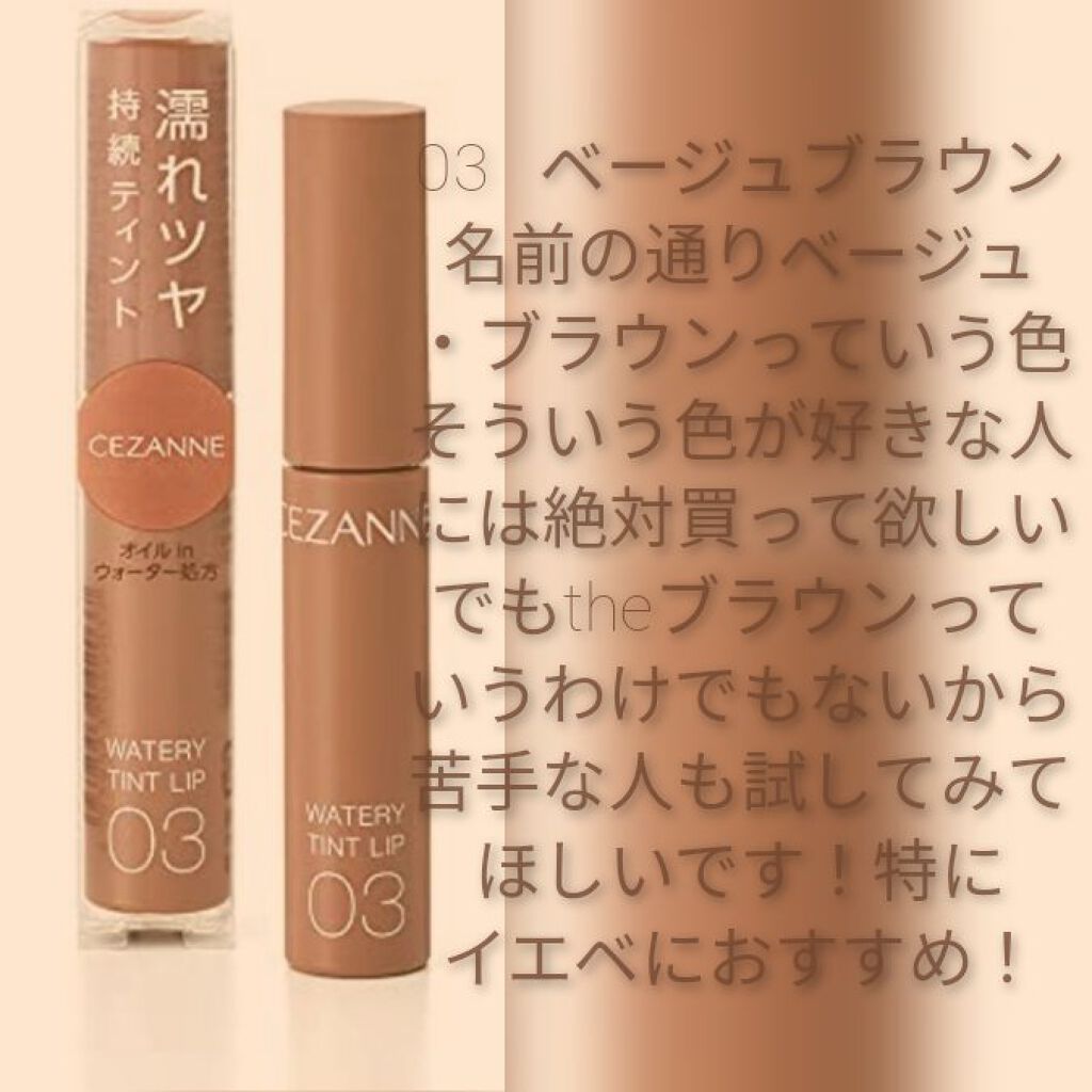 - ツヤ×色×潤いをキープする、セザンヌの新濡れツヤリップ みずみずしい濡れツヤ感ある仕上がりで、発色とツヤが長続きするティントリップです。ティントの発色を透明のベールで覆うリップコートのような処方で、ツヤ感と色をキープします。さらに、唇表面のべたつきは少なく、しっとり潤うオイルinウォーター処方を採用しています。