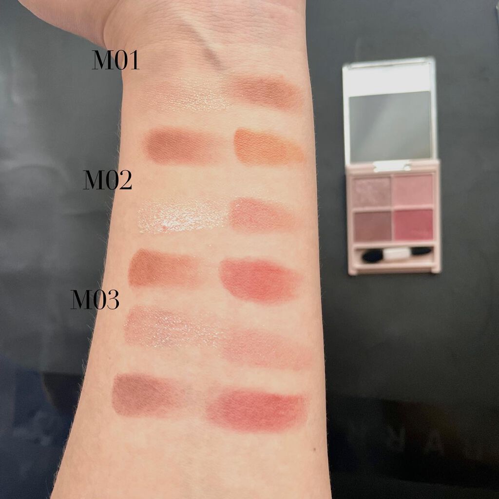 - シルキースフレアイズの姉妹品♡ 肌に溶け込むような透けマットシャドウ 透け感のある柔らかい仕上がりになるマット3色と、透け発色の繊細ラメ1色のパレットシャドウ♡ 完全マットアイや、ラメ×マットアイなど、メイクのパターンを楽しみましょう!