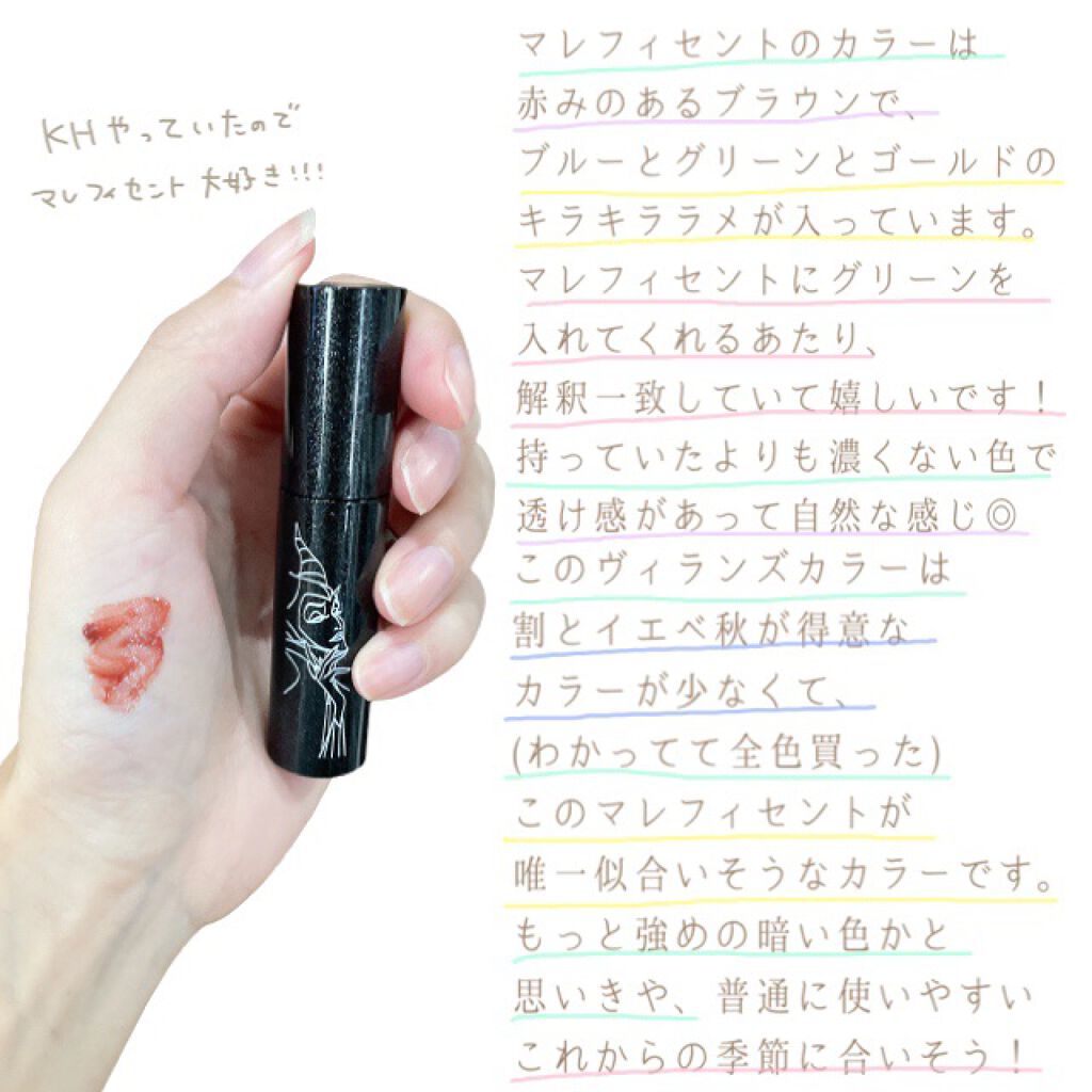 まずパッケージ!!!!かっこいい!!!! リップのパッケージも、普段のジューシーパンスパークリングティントの薄いピンクの可愛らしい印象とは正反対に真っ黒のデザインがかっこいい。そしてキラキラしているのも素敵。もうこの時点で勝ちです。 普段使いも全然出来そうなカラーでわたしは特にマレフィセントデザインがお気に入り。薄めのキラキラブラウンがかわいい◎ ジューシーパン スパークリングティントは各色に細かいカラーラメが入っているのですがこのマレフィセントデザインのブラウンティントにグリーンのラメを入れると考えてくれたのは誰ですか?天才です。マレフィセントのイメージカラーは緑なので(緑の炎出したりするので)いやほんと天才です。ありがとう。
