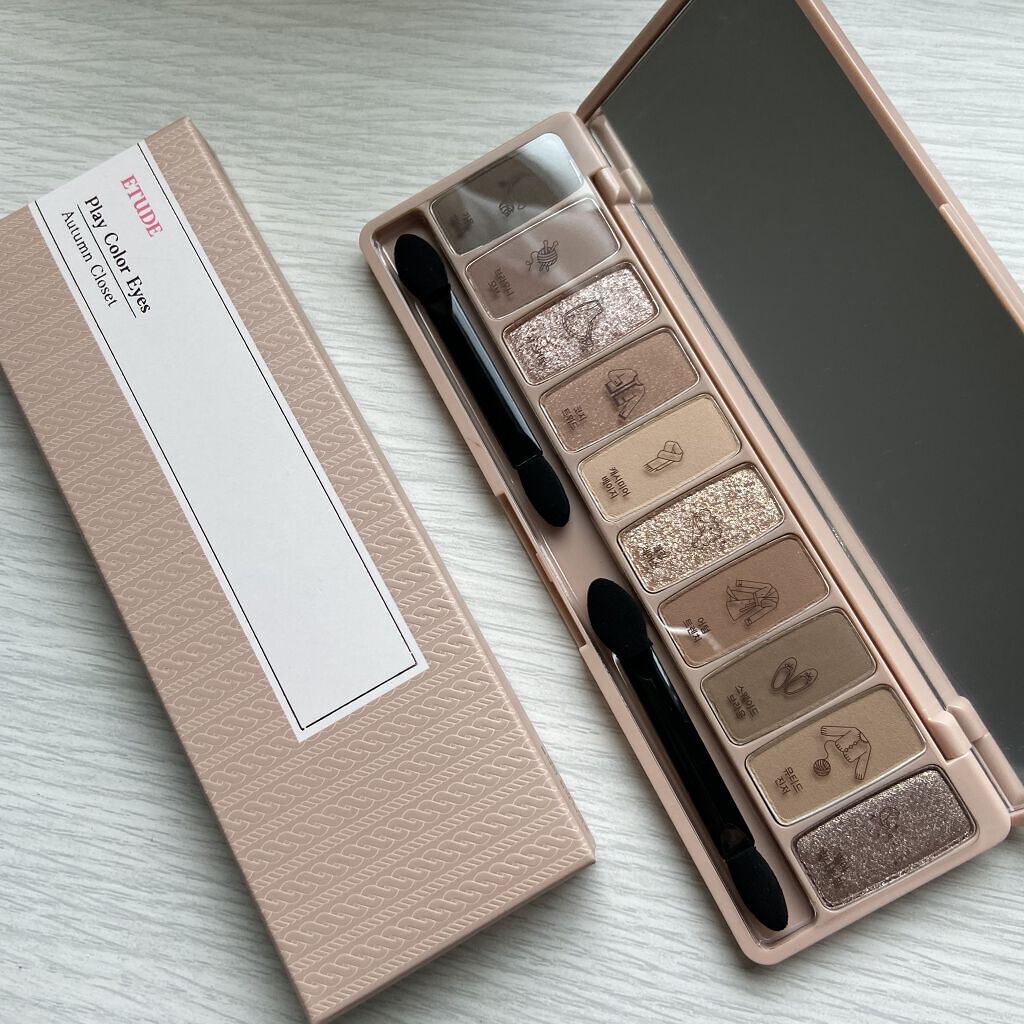 ETUDE エチュードプレイカラーアイシャドウオータムクローゼット 秋のクローゼットからインスパイアされたグレージュカラーが楽しめる10色入りアイシャドウパレットマット多めでミューテッドサマーに合いそうなカラーが幾つか入っていたので...