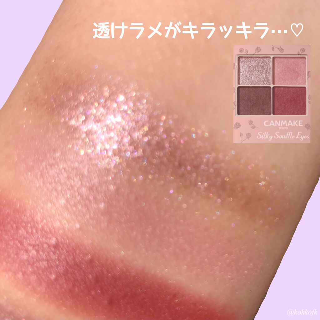 キャンメイクシルキースフレアイズマットタイプM04キューピッドペタル¥825◇質感(マット3、小粒ラメ1)質感はマットですがふわっとしていて透け感があるので色を重ねても重くなったり濁ったりしないのが特徴です◎ラメは小粒ですが思った以上にキラッ...