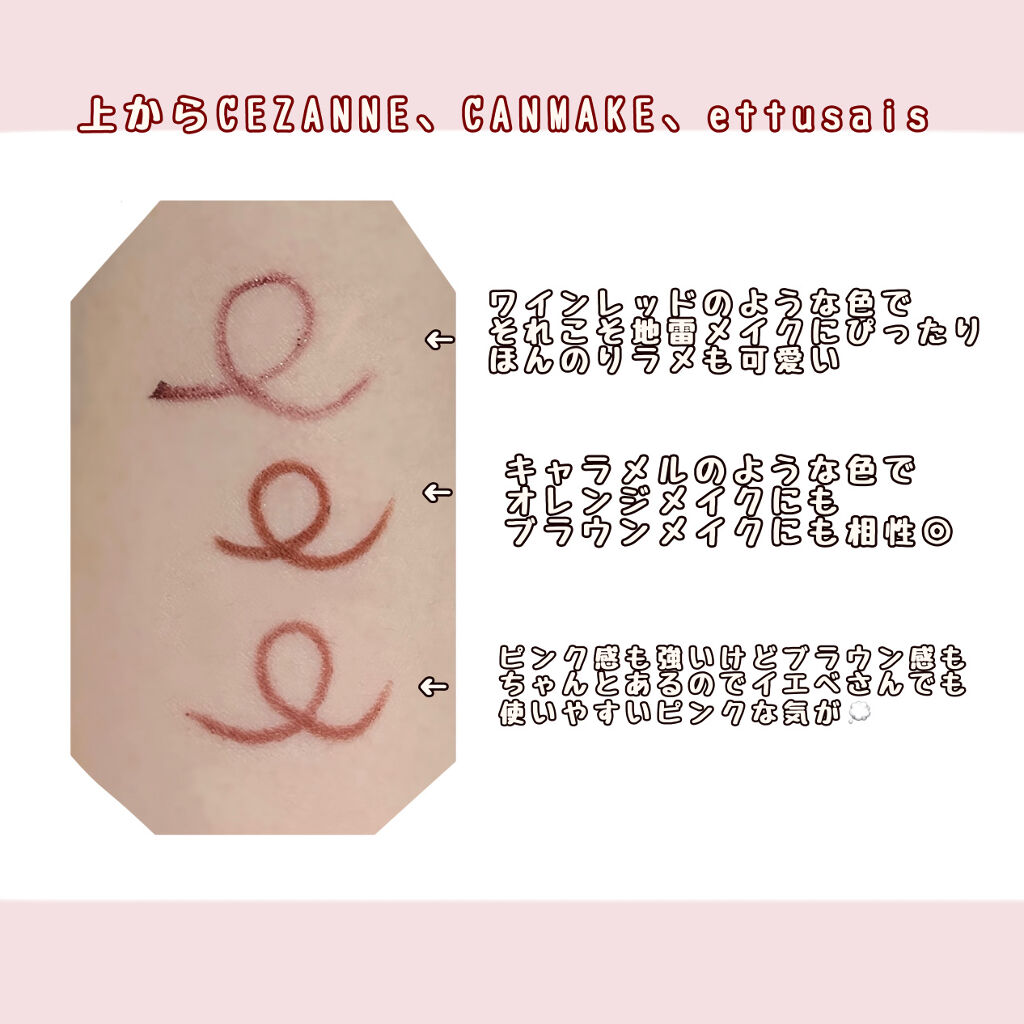 CEZANNEジェルアイライナー20 バーガンディー¥550色がとっても可愛くて好きな人が多いはず🥺 ただ、人によってグリグリ書かないと色がのらないって場合もあるみたいです💦 CANMAKEクリーミータッチライナーNo.05 ビターキャラメル¥715オレンジ感の強いブラウンで垢抜けな印象✨ ほんっとにスルスルかけて全然よれないのにこの値段はほんとにバグです🤦♀️ ettusaisアイエディション(ジェルライナー)02 ピンクブラウン¥1320ピンクだけどブラウン感もある馴染みやすいピンク! 色んなメイクに使いやすいです✨ これもCANMAKEのと同様スルスル書けて使いやすいです!