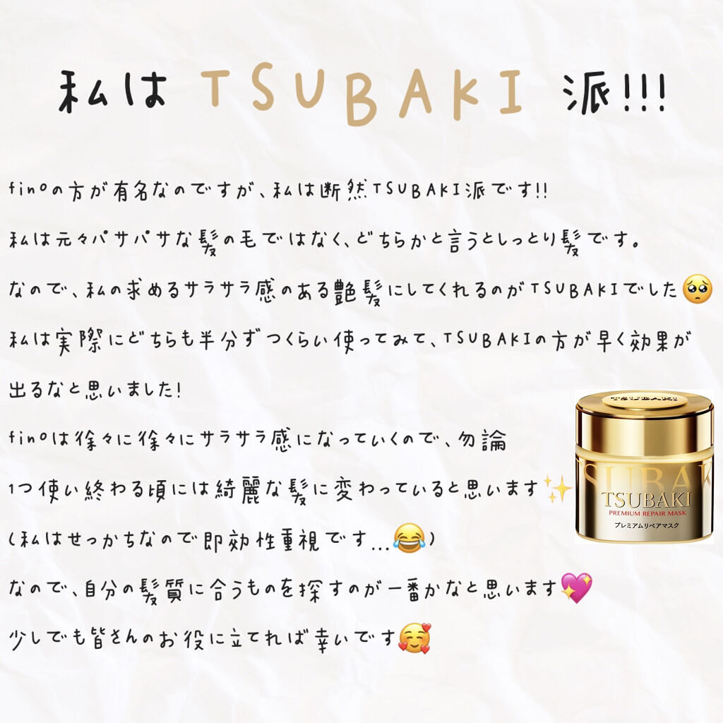 私のようなしっとり髪の人はツバキをオススメします✨乾かす時にはもうサラサラ感を感じるのでほんとにオススメです😂😂 フィーノはしっとりとしたまとまりのある髪質になるので、「髪の毛がパサついてきたな」「カラーしてから傷んだな」と思う方にすっごくオススメです👐🏻🤍 フィーノもツバキもどちらも独特な香りを持たず、いい匂いです🐮𓈒𓂂𓏸