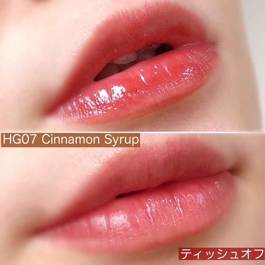私が頂いた色はHG08 ヘーゼルナッツシロップHG09イチジクシロップ甘い香りがしてもはや美味しい😋💕 SEASON2は全部で6色☆HG05 ハニーシロップ☆HG06 グレープフルーツシロップ☆HG07 シナモンシロップ☆HG08 ヘーゼルナッツシロップ☆HG09 イチジクシロップ☆HG10 チェリーシロップ全部 秋カラーでこれから大活躍しそうな色ばかり🍁 テクスチャーはベタ付きもなく透明なオイルの光沢で艶やか✨水分感もあっていい感じ発色もとっても良くてティントなので落ちにくくて使いやすかったです✨