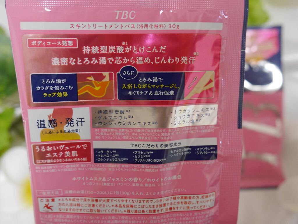 - お風呂のお湯が、全身を温かく包みこむ「とろみ美容液」のように。とろみ湯で美肌ケア+入浴による温浴効果で発汗&代謝サポート。 ①TBCエステティックコース使用厳選美容成分配合 ②TBCボディコースの理論を基に開発 ③入浴効果サポート成分配合