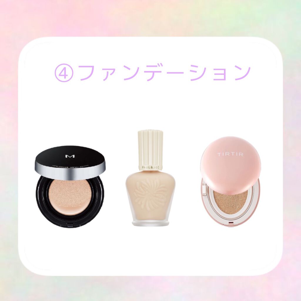 必ずこの順番じゃ無いとダメって訳ではありませんが正しいと言われている順番を教えます ベースメイクがうまくいくと、1日気持ちよく過ごせますよね✳︎ 崩れにくくもなるし、この順番がおすすめです ①日焼け止め サンカットR トーンアップUV エッセンス ②下地 CEZANNE 皮脂テカリ防止下地 ライトブルー ③コンシーラー the SAEM カバーパーフェクト チップ コンシーラー 1.25 ライトベージュ ④ファンデーション TIRTIR ティルティル マスクフィットオールカバークッション ⑤フェイスパウダー キャンメイク マシュマロフィニッシュパウダー ML マットライトオークル
