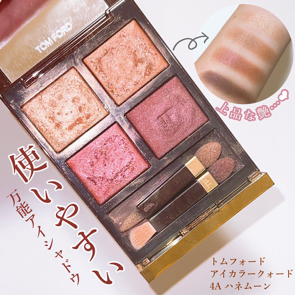 大好きなトムフォードのアイシャドウ✨ ハネムーンは特に上段2色が大好きです🥰 4色のカラーハーモニーで構成されたアイシャドウ。テクスチャーは見たままの鮮やかな発色と色持ちを演出ます。 シアー スパークル、サテン、シマー、マットが絶妙に配色され、ソフトから濃いルックまで自在に。