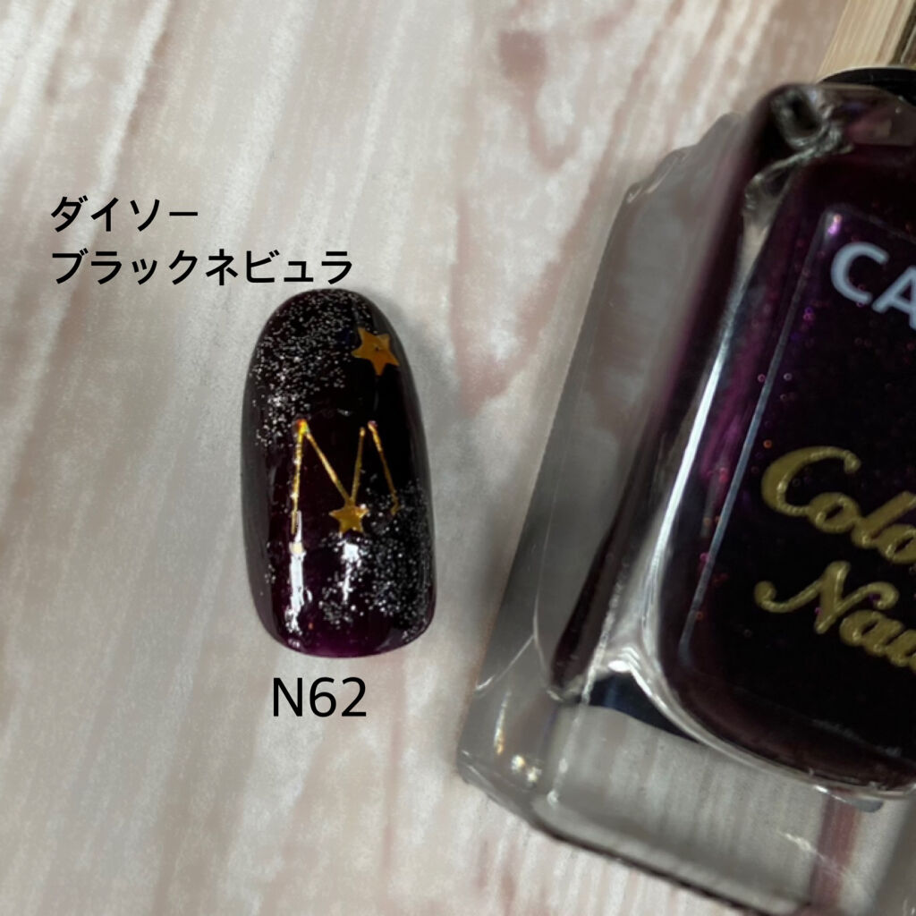 可愛いキャラメルカラー。赤の微細ラメがチラチラと光ります。ハロウィンネイルにもぴったり。 パールがぎっしり入った深い赤。 少しムラになりやすいので、2度塗りがおすすめです。 1度塗りでシアーなぶどう色。2度塗りすると宇宙を思わせるような黒に近い紫に。赤・紫・ゴールドの微細ラメが光ります。重ね塗りでかなり印象が変わるカラーです。こちらも1度塗りだとムラになりますが、N61ルビーレッドと違ってニュアンスのあるムラ感です。