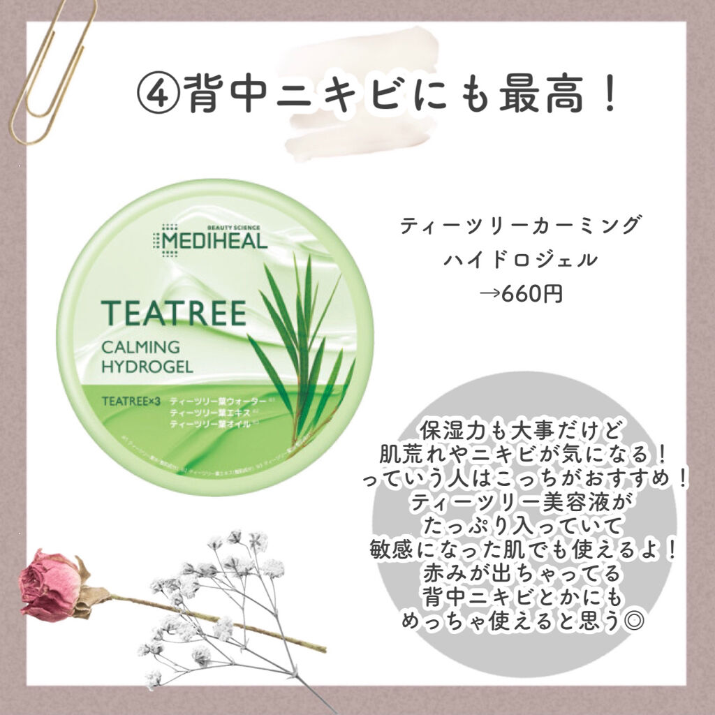 *-*-*-*-*-*-*-*♡♡♡MEDIHEALティーツリーカーミングハイドロジェル何個もリピートしてるアイテム😍ボディケアに使ってる🩷ジェルタイプで肌にたっぷり水分チャージしてくれる😊ぷるぷるテクスチャーでスーッと肌になじむからベタつき...