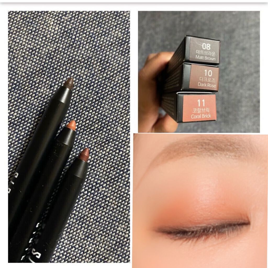 韓国の有名芸能人が使ったアイメイク商品が【ドン・キホーテ】で発売中🐧✨(Lovelyzのミジュさんが韓国番組「ビューティーユーレカ」に出演し愛用アイテムだと紹介したそう) 滑らかなテクスチャーでスルスル描けてお気に入り!! 繰り戻せる繰り出し式で、内蔵シャープナー付きだから先が丸まった時すぐに削れておすすめ◎ 擦っても滲みにくく、水にも強い印象です❣️ 最近のお気に入りは11.CORAL BRICKを下まつ毛の際に引くメイク!!