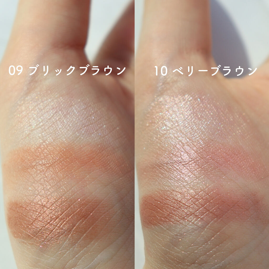 - <01 ナチュラルブラウン> A:ジメチコン、(ジメチコン/ビニルジメチコン)クロスポリマー、メチルパラベン、ラウロイルリシン、スクワラン、トコフェロール、マカデミア種子油、ホホバ種子油、シリカ、ヒアルロン酸Na、(+/-)マイカ、酸化チタン、酸化鉄、酸化スズ B・C:タルク、窒化ホウ素、トリエチルヘキサノイン、ジメチコン、リンゴ酸ジイソステアリル、ヘキサ(ヒドロキシステアリン酸/ステアリン酸/ロジン酸)ジペンタエリスリチル、ミリスチン酸亜鉛、メチルパラベン、ステアリン酸Mg、スクワラン、シリカ、トコフェロール、ホホバ種子油、マカデミア種子油、ヒアルロン酸Na、(+/-)マイカ、酸化鉄、酸化チタン、グンジョウ、酸化スズ <02 ローズブラウン> A:ジメチコン、(ジメチコン/ビニルジメチコン)クロスポリマー、メチルパラベン、ラウロイルリシン、スクワラン、トコフェロール、マカデミア種子油、ホホバ種子油、シリカ、ヒアルロン酸Na、(+/-)マイカ、酸化チタン、酸化鉄、酸化スズ B・C:タルク、窒化ホウ素、トリエチルヘキサノイン、ジメチコン、リンゴ酸ジイソステアリル、ヘキサ(ヒドロキシステアリン酸/ステアリン酸/ロジン酸)ジペンタエリスリチル、ミリスチン酸亜鉛、メチルパラベン、ステアリン酸Mg、スクワラン、シリカ、トコフェロール、ホホバ種子油、マカデミア種子油、ヒアルロン酸Na、(+/-)マイカ、酸化鉄、酸化チタン、グンジョウ、酸化スズ <04 ピンクブラウン> A:ジメチコン、(ジメチコン/ビニルジメチコン)クロスポリマー、メチルパラベン、ラウロイルリシン、スクワラン、トコフェロール、ホホバ種子油、マカデミア種子油、シリカ、ヒアルロン酸Na、(+/-)マイカ、酸化チタン、酸化鉄、赤226、硫酸Ba B・C:タルク、窒化ホウ素、トリエチルヘキサノイン、リンゴ酸ジイソステアリル、ジメチコン、ヘキサ(ヒドロキシステアリン酸/ステアリン酸/ロジン酸)ジペンタエリスリチル、ミリスチン酸亜鉛、メチルパラベン、ステアリン酸Mg、スクワラン、トコフェロール、ホホバ種子油、マカデミア種子油、シリカ、ヒアルロン酸Na、(+/-)マイカ、酸化鉄、酸化チタン、グンジョウ、コンジョウ、酸化スズ <06 オレンジカシス> A:ジメチコン、(ジメチコン/ビニルジメチコン)クロスポリマー、メチルパラベン、ラウロイルリシン、スクワラン、トコフェロール、ホホバ種子油、マカデミア種子油、シリカ、ヒアルロン酸Na、水酸化Al、マイカ、酸化チタン、酸化鉄 B・C:タルク、窒化ホウ素、トリエチルヘキサノイン、リンゴ酸ジイソステアリル、ジメチコン、ヘキサ(ヒドロキシステアリン酸/ステアリン酸/ロジン酸)ジペンタエリスリチル、ミリスチン酸亜鉛、メチルパラベン、ステアリン酸Mg、スクワラン、トコフェロール、ホホバ種子油、マカデミア種子油、ヒアルロン酸Na、シリカ、マイカ、酸化鉄、酸化チタン、赤226、ホウケイ酸(Ca/Al)、酸化スズ、グンジョウ、硫酸Ba <07 レッドブラウン> A:ジメチコン、(ジメチコン/ビニルジメチコン)クロスポリマー、メチルパラベン、ラウロイルリシン、スクワラン、トコフェロール、ホホバ種子油、マカデミア種子油、シリカ、ヒアルロン酸Na、マイカ、酸化チタン、酸化鉄 B・C:タルク、窒化ホウ素、トリエチルヘキサノイン、リンゴ酸ジイソステアリル、ジメチコン、ヘキサ(ヒドロキシステアリン酸/ステアリン酸/ロジン酸)ジペンタエリスリチル、ミリスチン酸亜鉛、メチルパラベン、ステアリン酸Mg、スクワラン、トコフェロール、ホホバ種子油、マカデミア種子油、シリカ、ヒアルロン酸Na、マイカ、酸化鉄、酸化チタン、ホウケイ酸(Ca/Al)、グンジョウ、赤226 <08 ハニーブラウン> A:ジメチコン、(ジメチコン/ビニルジメチコン)クロスポリマー、メチルパラベン、ラウロイルリシン、ヒアルロン酸Na、マカデミア種子油、ホホバ種子油、スクワラン、トコフェロール、シリカ、マイカ、酸化チタン、酸化鉄 B・C:タルク、窒化ホウ素、トリエチルヘキサノイン、リンゴ酸ジイソステアリル、ジメチコン、ヘキサ(ヒドロキシステアリン酸/ステアリン酸/ロジン酸)ジペンタエリスリチル、ミリスチン酸亜鉛、メチルパラベン、ステアリン酸Mg、スクワラン、トコフェロール、ホホバ種子油、マカデミア種子油、シリカ、ヒアルロン酸Na、マイカ、酸化鉄、ホウケイ酸(Ca/Al)、酸化チタン <09 ブリックブラウン> A:ジメチコン、タルク、(ジメチコン/ビニルジメチコン)クロスポリマー、トリ(カプリル酸/カプリン酸)グリセリル、カルナウバロウ、メチルパラベン、ラウロイルリシン、スクワラン、トコフェロール、ホホバ種子油、マカデミア種子油、シリカ、ヒアルロン酸Na、マイカ、酸化チタン、酸化鉄 B・C:タルク、リンゴ酸ジイソステアリル、ジメチコン、ジエチルヘキサン酸ネオペンチルグリコール、ワセリン、ミリスチン酸亜鉛、シリカ、メチルパラベン、スクワラン、セスキイソステアリン酸ソルビタン、トコフェロール、ホホバ種子油、マカデミア種子油、ヒア