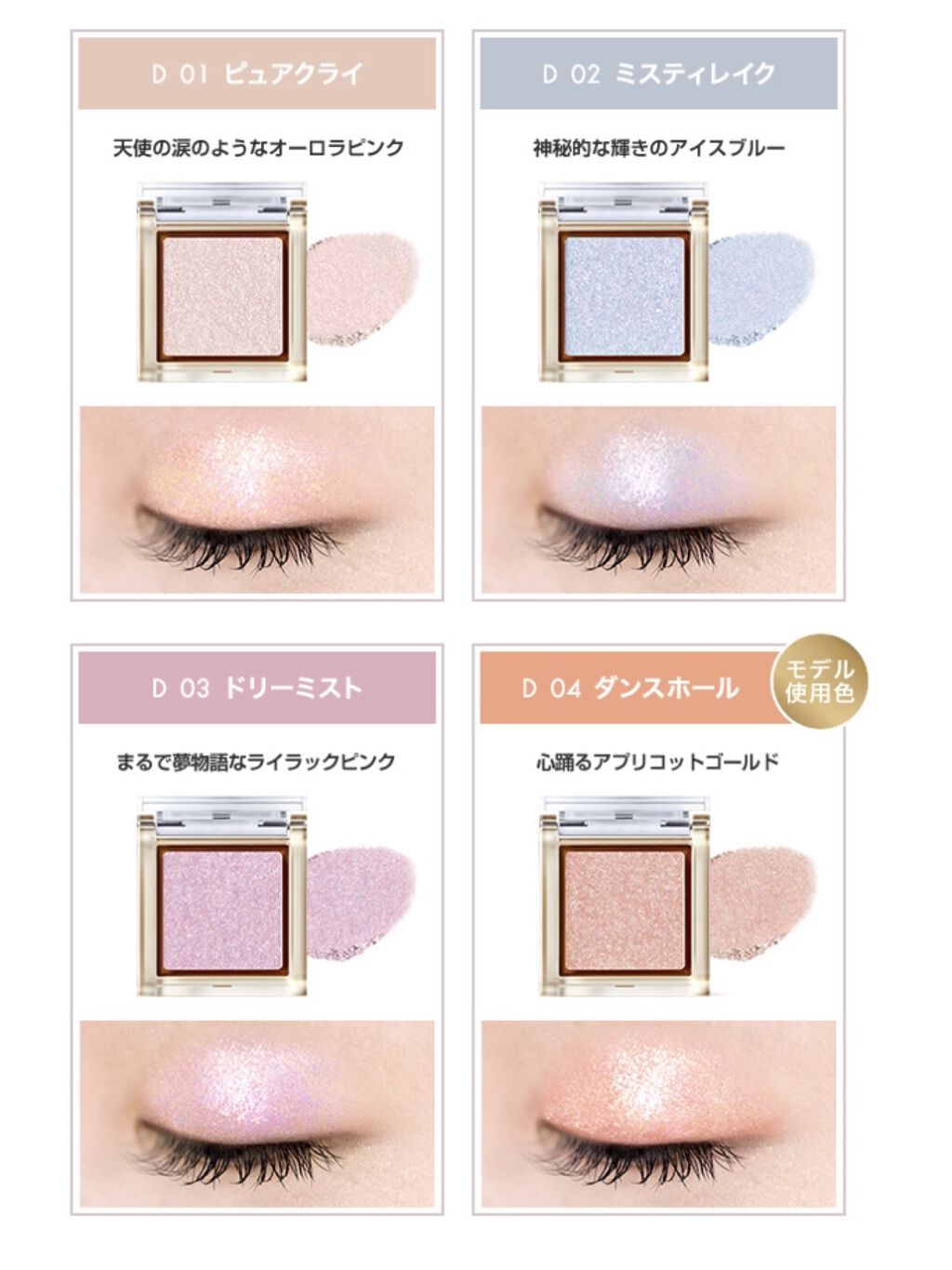 - 【全成分表示】 タルク、トリエチルヘキサノイン、リンゴ酸ジイソステアリル、イソステアリン酸水添ヒマシ油、ポリグリセリル-3ポリジメチルシロキシエチルジメチコン、ラウリン酸亜鉛、スクワラン、トコフェロール、メチルパラベン、(+/-)グンジョウ、シリカ、ホウケイ酸(Ca/Al)、マイカ、金、銀、酸化スズ、酸化チタン、酸化鉄、赤226" 【R01~R06共通】 タルク、トリエチルヘキサノイン、リンゴ酸ジイソステアリル、イソステアリン酸水添ヒマシ油、ポリグリセリル-3ポリジメチルシロキシエチルジメチコン、ラウリン酸亜鉛、スクワラン、トコフェロール、メチルパラベン、(+/-)グンジョウ、シリカ、ホウケイ酸(Ca/Al)、マイカ、酸化スズ、酸化チタン、酸化鉄、赤202、赤226" 【D01~D04共通】 ジメチコン、リンゴ酸ジイソステアリル、タルク、アルキル(C26-28)ジメチコン、(ジメチコン/ビニルジメチコン)クロスポリマー、スクワラン、カルナウバロウ、PEG-10ジメチコン、ポリメタクリル酸メチル、(+/-)グンジョウ、コンジョウ、ホウケイ酸(Ca/Al)、マイカ、酸化チタン、酸化鉄、水酸化Al" 【F01~F06共通】 ジメチコン、アルキル(C26-28)ジメチコン、(ジメチコン/ビニルジメチコン)クロスポリマー、リンゴ酸ジイソステアリル、スクワラン、PEG-10ジメチコン、ポリメタクリル酸メチル、カルナウバロウ、(+/-)グンジョウ、マイカ、黄4、酸化チタン、酸化鉄、水酸化Al、赤226" 【G01~G04共通】 タルク、合成フルオロフロゴパイト、トリエチルヘキサノイン、リンゴ酸ジイソステアリル、イソステアリン酸水添ヒマシ油、スクワラン、トコフェロール、ラウリン酸亜鉛、メチルパラベン、(+/-)マイカ、酸化チタン、酸化鉄、赤226