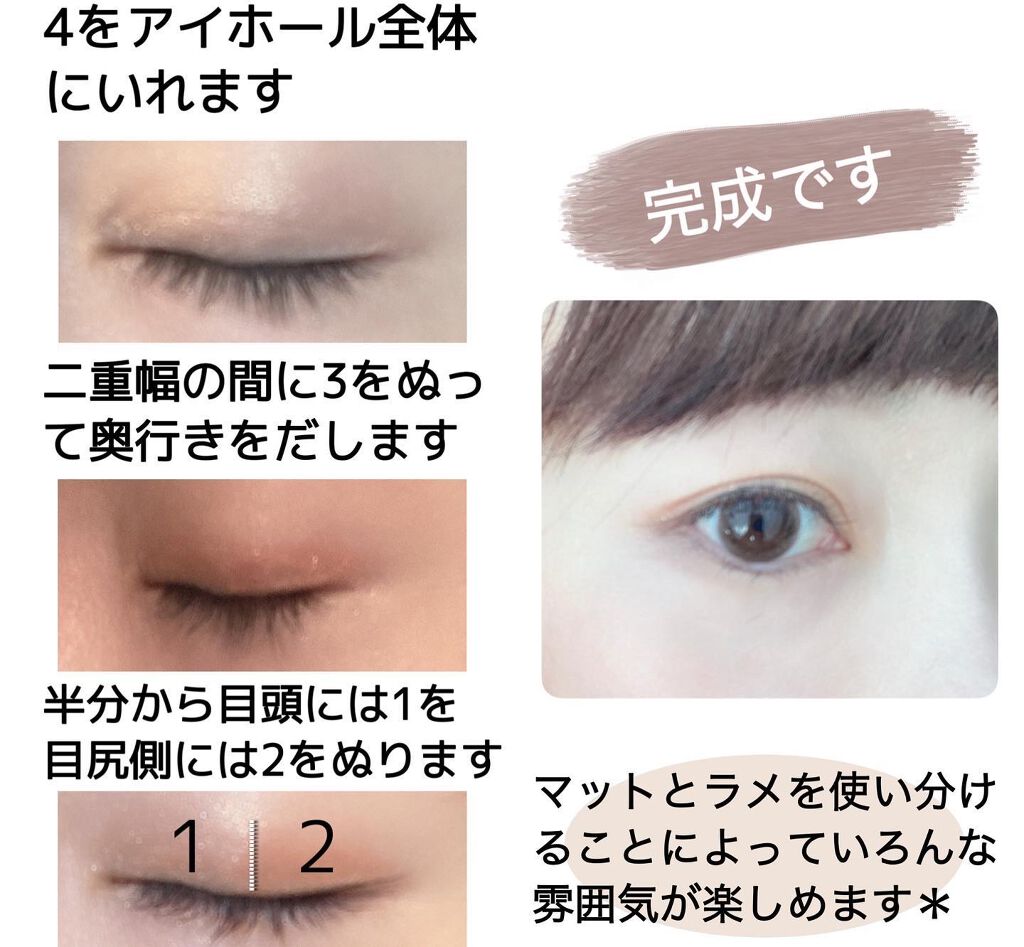 こちら全体的にピンクベースのアイシャドウになってます♪ 画像④の濃いブラウンもピンクベースになっているので、下瞼に塗った時に華やかで柔らかい印象になります* ①薄いピンクで4色の中で1番ラメが強いカラーになります。アイホール全体にぬることで可愛らしい印象になります。涙袋にも使えます。 ②比較的マットな薄いグレーです。アイホールにぬると綺麗な影ができるので、奥行きができ魅力的な目元なります。 ③ラメの入った明るいブラウンです。アイラインの線にそってぬるとくっきり大きな目になります。 ④4色の中で1番濃いブラウンです。下瞼にまつ毛にそって目の半分くらいまでぼかします。 ブルベさんに似合う肌を綺麗にみせてくれるアイシャドウです*