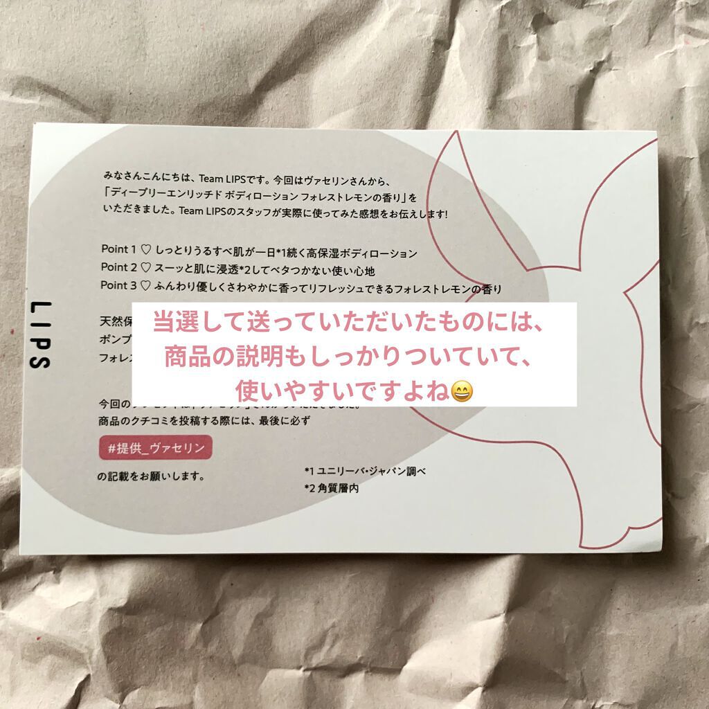 保湿といえばヴァセリン! コラーゲン・3種の天然保湿成分で しっとり柔らかい肌になります✨ フォレストレモンのさわやかな香りで お風呂上がりもリラックスできます🍋 ボディミルクですが香りが良いので ハンドクリームとしても使ってます💖 ラベンダーもあるみたいなので使ってみたい! 私はベタつき感が少し苦手なタイプですが こちらはベタつかずさらっとしています! 保湿もしっかりできるので乾燥しやすい これからの季節にいいですね✨