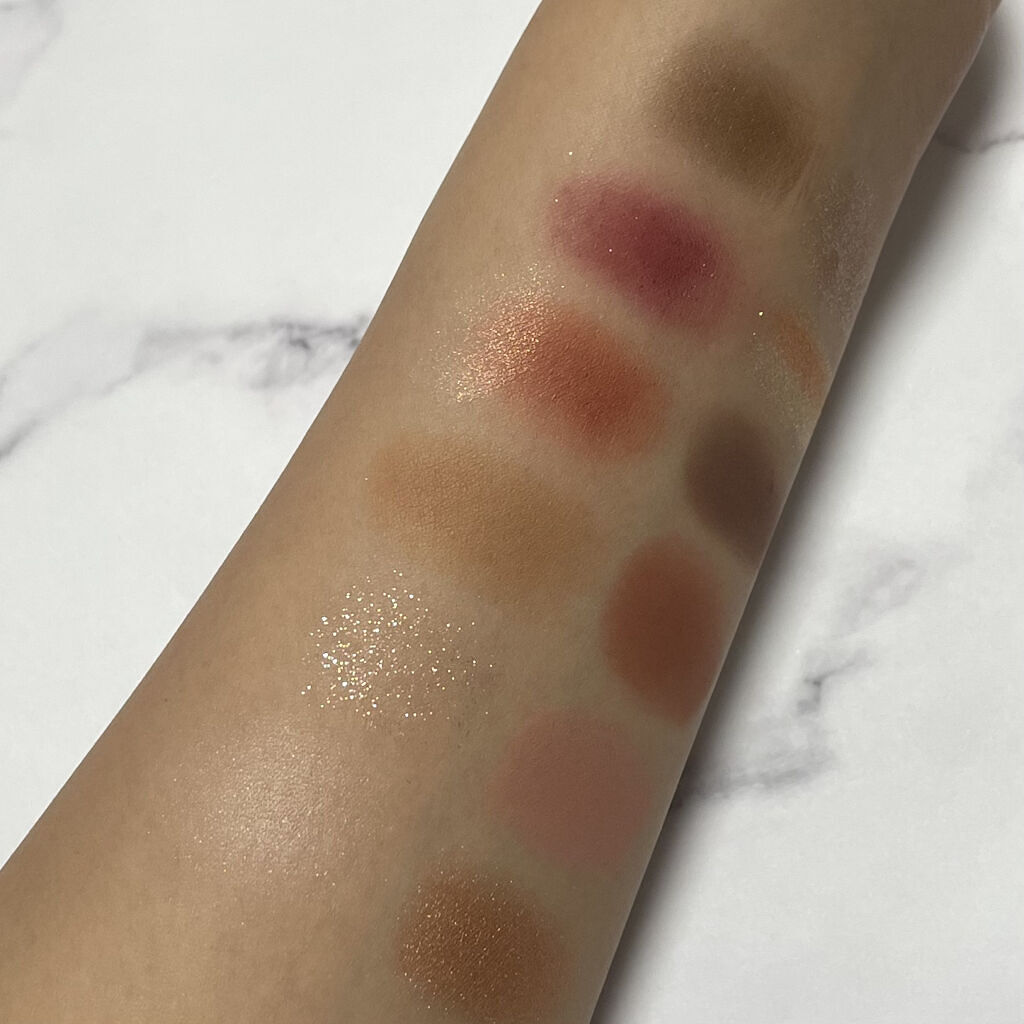 mude.の方がよりあたたかみのある印象で全体的に使いやすい色味が入っている感じ◎ ラメ感もギラギラするよりかは上品なキラキラ感✨ rom&ndはmude.に比べるとフレッシュな印象!春や夏に使うと映えそう❣️ ラメ感も強く、目立つかな。 似てるかもしれないからと買うのを長い間悩んでいましたが、仕上がりが全然変わってくるので、買って良かった😂❤️ 粉質はブランドも違うので違ったよ✨ rom&ndの方がしっとり感があって強く発色する感じ。 mude.は淡い発色で、初心者さんも使いやすいと思った🫶🏻