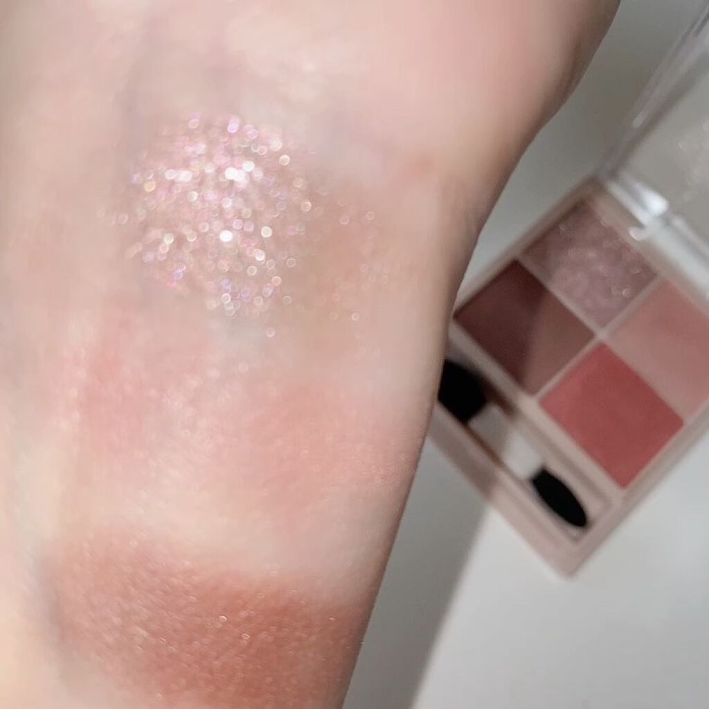 グレージュにピンクをプラスしたようなカラーが可愛い🩷 フワッとしたカラーで使いやすい。 粉飛びが少ない感じだし、ラメが1色。気分によってラメを足したり出来るのが好き✨️ そして思ったよりピンクが強め。締め色もちゃんとあるのも良い🙆