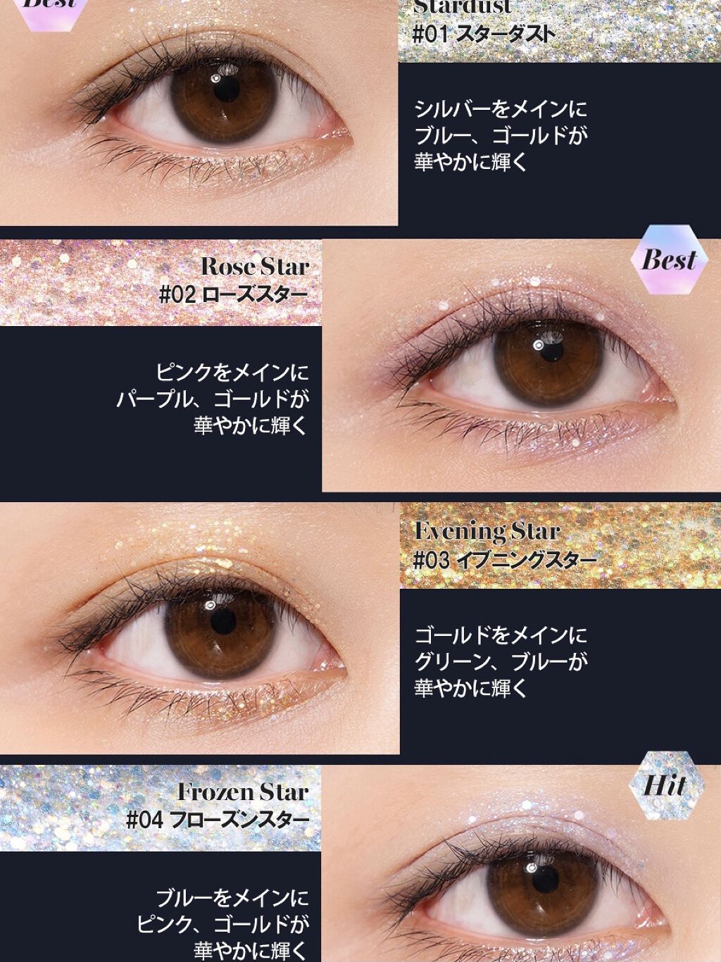 - <01 スターダスト(STARDUST)> 水、PET、ホ ウケイ酸(Ca/Al)、グリセリン、アクリレーツ コポリマー、ホウケイ酸( Ca/チタン)、1,2- ヘキサンジオール、(アク リル酸ヒドロキシエチル/ アクリロイルジメチルタウ リンNa)コポリマー、ス クワラン、AMP、エチル ヘキシルグリセリン、ポリ ソルベート60、イソステ アリン酸ソルビタン、トコ フェロール、カルボマー、酸化スズ、EDTA-2N a、フェノキシエタノール、銀、酸化チタン、(チタ ン/酸化チタン)焼結物、酸化鉄 <02 ローズスター(ROSE STAR)> 水、PET、ポリ ブチレンテレフタレート、ア クリレーツコポリマー、グリ セリン、ホウケイ酸(Ca/ Al)、(エチレン/VA) コポリマー、ホウケイ酸(C a/Na)、ホウケイ酸(C a/Al)、1,2-ヘキサ ンジオール、(アクリル酸ヒ ドロキシエチル/アクリロイ ルジメチルタウリンNa)コ ポリマー、スクワラン、AM P、エチルヘキシルグリセリ ン、シリカ、ポリソルベート 60、イソステアリン酸ソル ビタン、トコフェロール、カ ルボマー、EDTA-2Na、酸化スズ、フェノキシエタ ノール、酸化チタン、酸化鉄、マイカ 使用方法 <03 イブニングスター(EVENING STAR)> 水、PET、ポリ ブチレンテレフタレート、グ リセリン、アクリレーツコポ リマー、ホウケイ酸(Ca/ チタン)、(エチレン/VA )コポリマー、ホウケイ酸( Ca/Al)、1,2-ヘキ サンジオール、シリカ、(ア クリル酸ヒドロキシエチル/ アクリロイルジメチルタウリ ンNa)コポリマー、スクワ ラン、AMP、エチルヘキシ ルグリセリン、ポリソルベー ト60、イソステアリン酸ソ ルビタン、トコフェロール、カルボマー、EDTA-2N a、酸化スズ、フェノキシエ タノール、酸化鉄、酸化チタ ン、(チタン/酸化チタン) 焼結物 <04 フローズンスター(FROZEN STAR)> 水、PET、ポリ ブチレンテレフタレート、ア クリレーツコポリマー、グリ セリン、ホウケイ酸(Ca/ Al)、(エチレン/VA) コポリマー、1,2-ヘキサ ンジオール、(アクリル酸ヒ ドロキシエチル/アクリロイ ルジメチルタウリンNa)コ ポリマー、スクワラン、AM P、エチルヘキシルグリセリ ン、ホウケイ酸(Ca/チタ ン)、シリカ、ポリソルベー ト60、イソステアリン酸ソ ルビタン、トコフェロール、カルボマー、EDTA-2N a、酸化スズ、フェノキシエ タノール、酸化チタン、酸化 鉄、マイカ、(チタン/酸化 チタン)焼結物 <05 ラビーフレア(LOVEY FLARE)> 水、PET、ホウケイ酸(Ca/Al)、グリセリン、ホウケイ酸(Ca/チタン)、酸化チタン、アクリレーツコポリマー、PVP、1,2-ヘキサンジオール、シリカ、カルボマー、フェノキシエタノール、(アクリル酸ヒドロキシエチル/アクリロイルジメチルタウリンNa)コポリマー、スクワランAMP、エチルヘキシルグリセリン、酸化スズ、酸化鉄、EDTA-2Na、マイカ、ポリソルベート60、BG、ペンチレングリコール、ダイズ種子エキス、イソステアリン酸ソルビタン、アセチルグルコサミン、ヒアルロン酸Na、フナバラソウエキス、ヒドロキシアセトフェノン、オクタンジオール、タチアオイ花エキス、ヒアルロン酸クロスポリマーNa、トコフェロール、カプリリルグリコール <06 リトルメテオ(LTTLE METEOR)> 水、PET、ホウケイ酸(Ca/Al)、ホウケイ酸(Ca/チタン)、グリセリン、酸化チタン、アクリレーツコポリマー、PVP、1,2-ヘキサンジオール、シリカ、合成フルオロフロゴパイト、カルボマー、フェノキシエタノール、(アクリル酸ヒドロキシエチル/アクリロイルジメチルタウリンNa)コポリマー、スクワラン、AMP、エチルヘキシルグリセリン、酸化スズ、EDTA-2Na、ポリソルベート60、BG、ペンチレングリコール、ダイズ種子エキス、イソステアリン酸ソルビタン、アセチルグルコサミン、ヒアルロン酸Na、フナバラソウエキス、ヒドロキシアセトフェノン、オクタンジオール、タチアオイ花エキス、ヒアルロン酸クロスポリマーNa、トコフェロール、カプリリルグリコール <07 ミスティックムーン(MYSTIC MOON)> 水、PET、ホウケイ酸(Ca/Al)、グリセリン、ホウケイ酸(Ca/チタン)、酸化チタン、アクリレーツコポリマー、PVP、1,2-ヘキサンジオール、シリカ、カルボマー、フェノキシエタノール、(アクリル酸ヒドロキシエチル/アクリロイルジメチルタウリンNa)コポリマー、スクワラン、AMP、マイカ、エチルヘキシルグリセリン、酸化スズ、酸化鉄、EDTA-2Na、ポリソルベート60、BG、ペンチレングリコール、ダイズ種子エキス、イソステアリン酸ソルビタン、アセチルグルコサミン、ヒアルロン酸Na、コンジョウ、フナバラソウエキス、ヒドロキシアセトフェノン、オクタンジオール、タチアオイ花エキス、ヒアルロン酸クロスポリマーNa、トコフェロール、カプリリルグリコール <08 ミンティウェイ(MINTY WAY)> 水、PET、ホウケイ酸(Ca/Al)、グリセリン、酸化チタン、アクリレーツコポリマー、PVP、合成フルオロフロゴパイト、1,2-ヘキサンジオール、ホウケイ酸(Ca/チタン)、カルボマー、フェノキシエタノール、(アクリル酸ヒドロキシエチル/アクリロイルジメチルタウリンNa)コポリマー、シリカ、スクワラン、AMP、エチルヘキシルグリセリン、EDTA-2