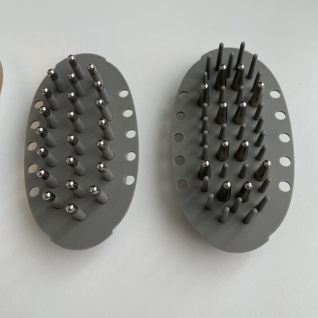 - 頭皮の土台の筋肉、頭筋からケアするヘッドスパ体感のブラッシングリフト美顔器 ■2つのヘッドで、頭皮とお顔それぞれに適したモードでリフトケア※1 ※1 機械を上に動かすこと 1, SCALPモード 12本の電極ピンから頭皮専用の独自の低周波EMSを出力し、硬くなりがちな頭筋を刺激します。さらに、ブラッシングしながら毎分約7000回の微細な振動で、頭皮全体をストレッチしていきます。マイクロカレントも同時に出力しながら、低周波と振動のシナジーで効率的なケアが可能に。 2. FACEモード 22本の柔軟なピンで、“多点式”電極が低・中周波EMSを複雑に出力。30種類以上から構成される表情筋に対して、あらゆる方向からEMSを出力し多角的かつ集中的に表情筋を刺激します。さらにマイクロカレントも同時に出力し、表情まですっきりとした印象へ導きます。 ■アタッチメントを付け替えるだけで自動モード切り替え マグネット式のブラシアタッチメントを装着すると自動で識別しモード切り替え。難しい操作をすることなく簡単につけることができ、すぐにケアを始められます。 ■ドライでもお風呂でも使える設計 コンパクトで軽量。持ち運びにも便利なので、人と会う直前にさっと取り出し、すぐに引き締めケアをすることも可能。IPX5相当の防滴仕様なので、お風呂で使用することも。身体が温まった状態で使用することで効率的にケアできます。