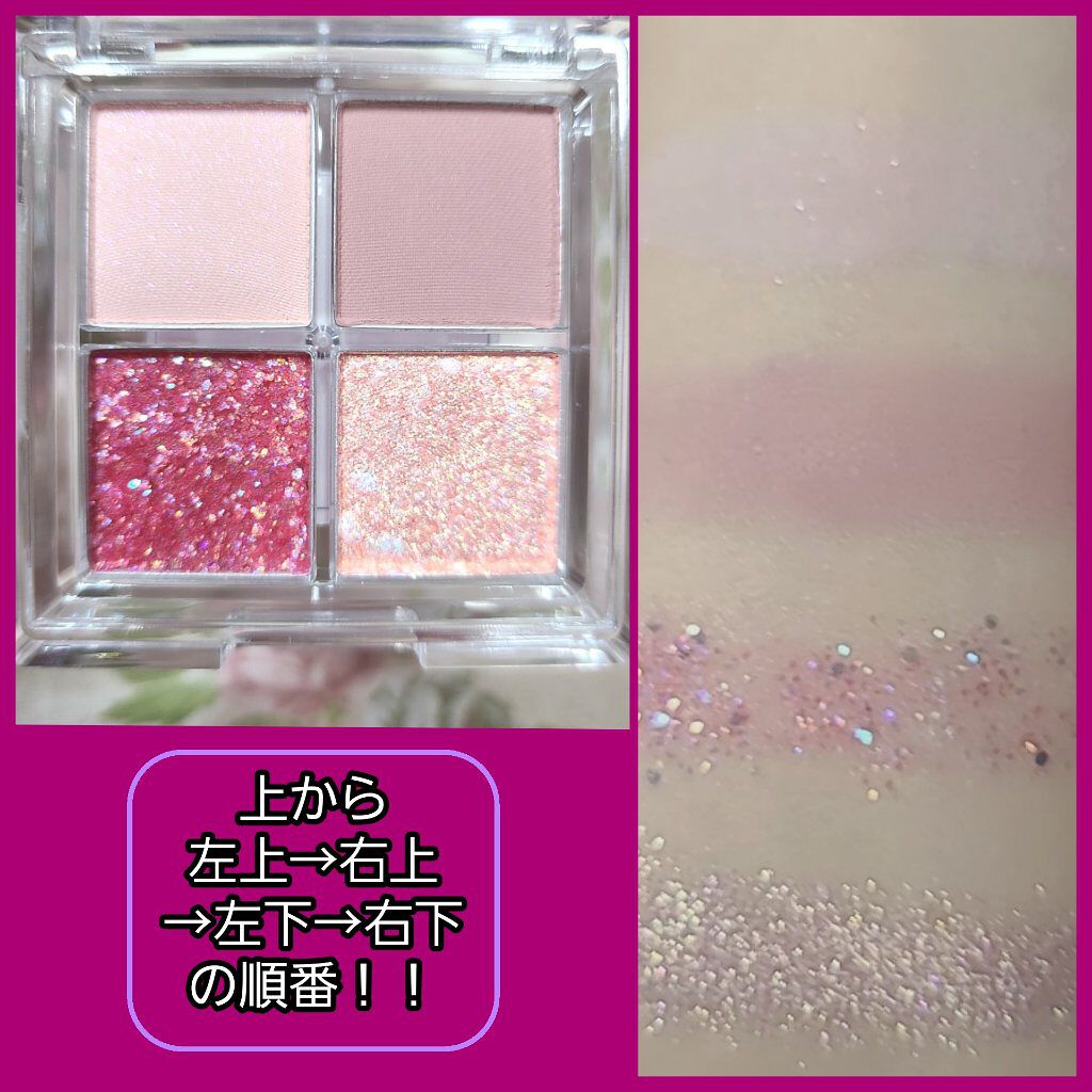 一応パケの裏には上のカラーからグラデーションにと書かれているけれど、縦割りにしてみました✨ CとDのカラーがベリーを感じさせるようなラメが良く見ると入っていてとても綺麗なカラーです❗ピンクとの相性抜群🎵 粉質も良く、お肌へも密着し、発色も良いし粉飛びも気にならず◎