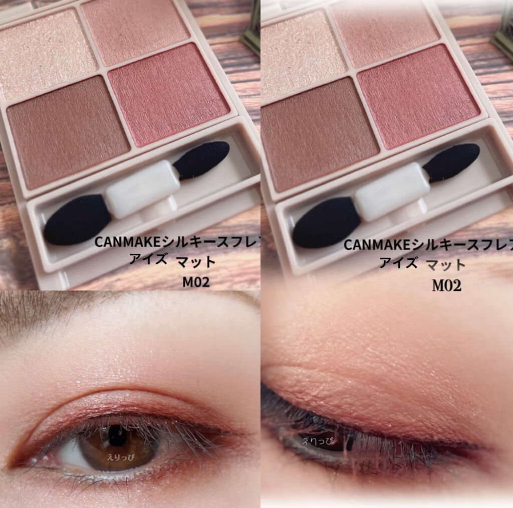 キャンメイク シルキースフレアイズマットタイプ今回はキャンメイクのシルキースフレアイズマットタイプ、"M02チャイブリック"をご紹介します✦質感✦マットアイシャドウ3色+ラメの4色パレットマットアイシャドウは韓国コスメのような完全にマットな質...