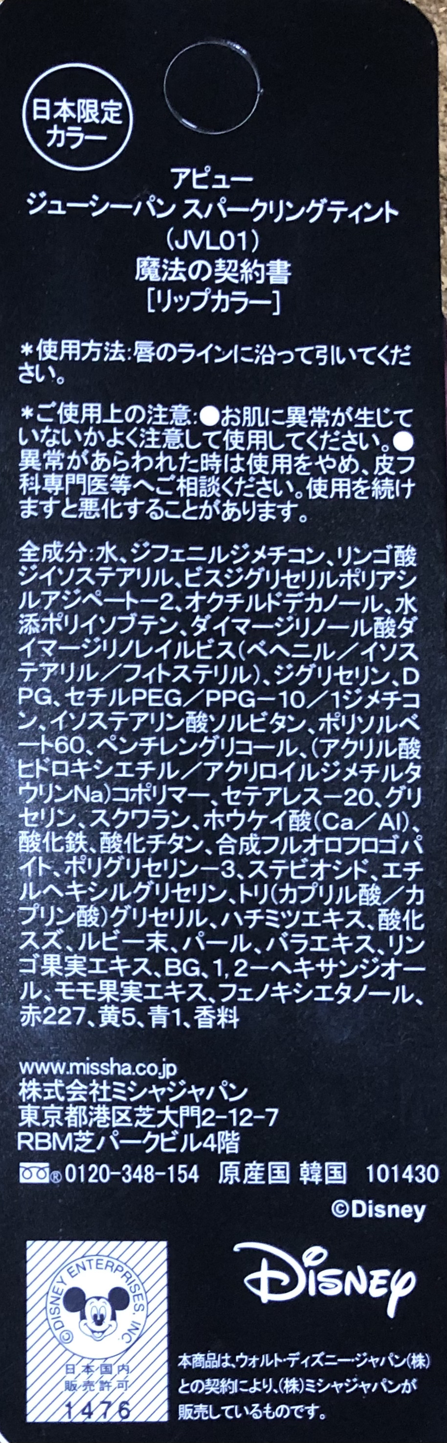 - <JBR01 呪いの糸車(マレフィセントデザイン)> 水、ジフェニルジメチコン、リンゴ酸ジイソステアリル、ビスジグリセリルポリアシルアジペート-2、オクチルドデカノール、水添ポリイソブテン、ダイマージリノール酸ダイマージリノレイルビス(ベヘニル/イソステアリル/フィトステリル)、ジグリセリン、DPG、セチルPEG/PPG-10/1ジメチコン、イソステアリン酸ソルビタン、ポリソルベート60、ペンチレングリコール、(アクリル酸ヒドロキシエチル/アクリロイルジメチルタウリンNa)コポリマー、セテアレス-20、ホウケイ酸(Ca/Al)、スクワラン、酸化チタン、グリセリン、ポリグリセリン-3、ステビオシド、ホウケイ酸(Ca/チタン)、エチルヘキシルグリセリン、トリ(カプリル酸/カプリン酸)グリセリル、ハチミツエキス、酸化スズ、ルビー末、パール、バラエキス、リンゴ果実エキス、BG、1,2-ヘキサンジオール、モモ果実エキス、フェノキシエタノール、黄4、赤227、黄5、青1、香料 <JRD02 禁断の毒りんご(白雪姫の魔女デザイン)> 水、ジフェニルジメチコン、リンゴ酸ジイソステアリル、ビスジグリセリルポリアシルアジペート-2、オクチルドデカノール、水添ポリイソブテン、ダイマージリノール酸ダイマージリノレイルビス(ベヘニル/イソステアリル/フィトステリル)、ジグリセリン、DPG、セチルPEG/PPG-10/1ジメチコン、イソステアリン酸ソルビタン、ポリソルベート60、ペンチレングリコール、ホウケイ酸(Ca/Al)、(アクリル酸ヒドロキシエチル/アクリロイルジメチルタウリンNa)コポリマー、セテアレス-20、スクワラン、グリセリン、酸化鉄、ポリグリセリン-3、ステビオシド、エチルヘキシルグリセリン、酸化チタン、トリ(カプリル酸/カプリン酸)グリセリル、ハチミツエキス、酸化スズ、ルビー末、パール、バラエキス、リンゴ果実エキス、BG、1,2-ヘキサンジオール、モモ果実エキス、フェノキシエタノール、赤227、黄5、赤104(1)、香料 <JVL01 魔法の契約書(アースラデザイン)> 水、ジフェニルジメチコン、リンゴ酸ジイソステアリル、ビスジグリセリルポリアシルアジペート-2、オクチルドデカノール、水添ポリイソブテン、ダイマージリノール酸ダイマージリノレイルビス(ベヘニル/イソステアリル/フィトステリル)、ジグリセリン、DPG、セチルPEG/PPG-10/1ジメチコン、イソステアリン酸ソルビタン、ポリソルベート60、ペンチレングリコール、(アクリル酸ヒドロキシエチル/アクリロイルジメチルタウリンNa)コポリマー、セテアレス-20、グリセリン、スクワラン、ホウケイ酸(Ca/Al)、酸化鉄、酸化チタン、合成フルオロフロゴパイト、ポリグリセリン-3、ステビオシド、エチルヘキシルグリセリン、トリ(カプリル酸/カプリン酸)グリセリル、ハチミツエキス、酸化スズ、ルビー末、パール、バラエキス、リンゴ果実エキス、BG、1,2-ヘキサンジオール、モモ果実エキス、フェノキシエタノール、赤227、黄5、青1、香料 <BE02 おねだりグアバ(オーロラ姫デザイン)> ジフェニルジメチコン、水、リンゴ酸ジイソステアリル、ビスジグリセリルポリアシルアジペート-2、オクチルドデカノール、水添ポリイソブテン、ダイマージリノール酸ダイマージリノレイルビス(ベヘニル/イソステアリル/フィトステリル)、ジグリセリン、セチルPEG/PPG-10/1ジメチコン、DPG、イソステアリン酸ソルビタン、ポリソルベート60、ペンチレングリコール、ホウケイ酸(Ca/Al)、(アクリル酸ヒドロキシエチル/アクリロイルジメチルタウリンNa)コポリマー、酸化チタン、グリセリン、セテアレス-20、スクワラン、ポリグリセリン-3、ステビオシド、エチルヘキシルグリセリン、トリ(カプリル酸/カプリン酸)グリセリル、ハチミツエキス、モモ果実エキス、酸化スズ、BG、ルビー末、パール、リンゴ果実エキス、バラエキス、1,2-ヘキサンジオール、フェノキシエタノール、黄5、赤227、赤104(1)、黄4、青1、香料 <CR01 オトメなナツメ (白雪姫デザイン)> ジフェニルジメチコン、水、リンゴ酸ジイソステアリル、ビスジグリセリルポリアシルアジペート-2、オクチルドデカノール、水添ポリイソブテン、ダイマージリノール酸ダイマージリノレイルビス(ベヘニル/イソステアリル/フィトステリル)、ジグリセリン、DPG、セチルPEG/PPG-10/1ジメチコン、イソステアリン酸ソルビタン、ポリソルベート60、ペンチレングリコール、ホウケイ酸(Ca/Na)、酸化チタン、(アクリル酸ヒドロキシエチル/アクリロイルジメチルタウリンNa)コポリマー、グリセリン、セテアレス-20、スクワラン、ポリグリセリン-3、ステビオシド、エチルヘキシルグリセリン、トリ(カプリル酸/カプリン酸)グリセリル、酸化スズ、ハチミツエキス、青1、モモ果実エキス、BG、パール、ルビー末、バラエキス、リンゴ果実エキス、1,2-ヘキサンジオール、フェノキシエタノール、黄5、赤227、赤104(1)、香料 <RD01 いちころライチ(アリエルデザイン)> ジフェニルジメチコン、水、リンゴ酸ジイソステアリル、ビスジグリセリルポリアシルアジペート-2、オク