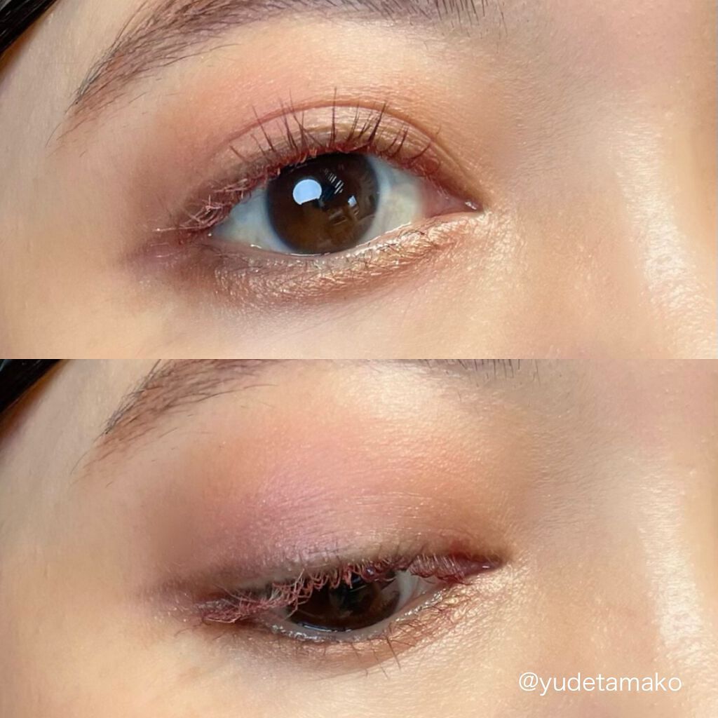左上のベージュに右上のブラウンを重ね、左下ピンクを目尻側に✨ 細筆に右下濃いブラウンを二重幅にしっかりつけて完成👏 さすがハネムーン🪶 ベスコスかも。。また使います❀.(*´▽`*)❀.