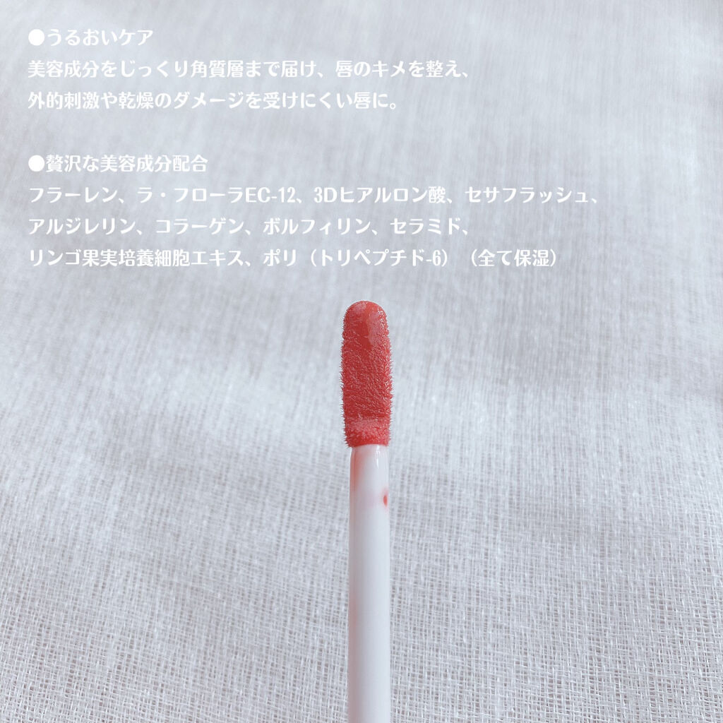 - 粘膜色をイメージしたカラーで唇を補正し、唇本来の美しさを惹きたたせる、カラープランパー。 メイクしながらどんな瞬間も唇ケア。塗るたびに、素の唇から美しく。 【ぷるんとボリュームUP※1】 縦ジワをカバーし、ぷっくり感UP※1 ハリのある、ぷるんとなめらかな唇に。 【ティント処方】 ティント効果で透け感発色が落ちずにつづく 【うるおいケア】 美容成分をじっくり角質層まで届け、唇のキメを整え、 外的刺激や乾燥のダメージを受けにくい唇に。 【贅沢な美容成分配合】 フラーレン、ラ・フローラEC-12※2、3Dヒアルロン酸※3、セサフラッシュ※4、アルジレリン※5、コラーゲン※6、ボルフィリン※7、セラミド※8、リンゴ果実培養細胞エキス、ポリ(トリペプチド-6)(全て保湿) ※1 メイクアップ効果による ※2 エンテロコッカスフェカリス ※3 ヒアルロン酸クロスポリマーNa ※4 加水分解ゴマタンパクPGプロピルメチルシランジオール ※5 アセチルへキサペプチド-8 ※6 加水分解コラーゲン ※7 ハナスゲ根エキス ※8 セラミドNP